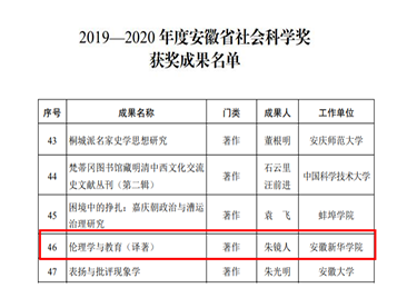 本网讯(通讯员:李彩平)日前,安徽省社科奖评奖办发布《省政府批复2019-2020年度安徽省社会科学奖获奖结果》。yl7703永利官网大学生素质教育研究中心研究员朱镜人教授的译著《伦理学与教育》喜获安徽省社科奖三等奖。