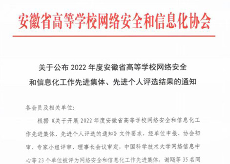 本网讯(通讯员:曲红)近日,安徽省高等学校网络安全和信息化协会发布《关于公布2022年度安徽省高等学校网络安全和信息化工作先进集体、先进个人评选结果的通知》,经过单位推荐、协会初审、专家评审和理事长审定,永利官网信息化建设与发展中心王志荣获2022年度网络安全和信息化工作先进个人称号。
