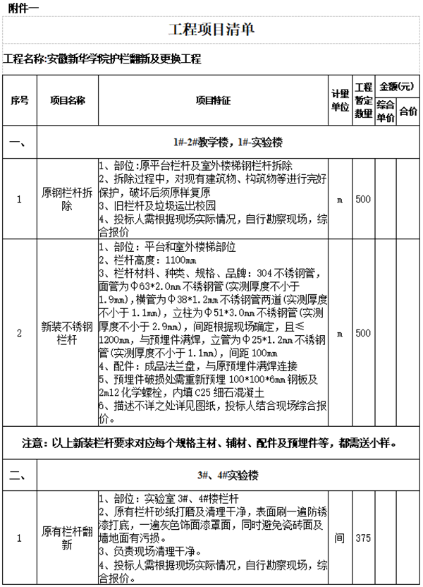 根据2020年建设计划需要,拟对:(1)1#-2#实验楼、1#~2#教学楼室外扶梯及平台栏杆进行更换;(2)实验3#~4#围栏翻新项目进行公开询价。欢迎符合资质要求的优质供应商参与。