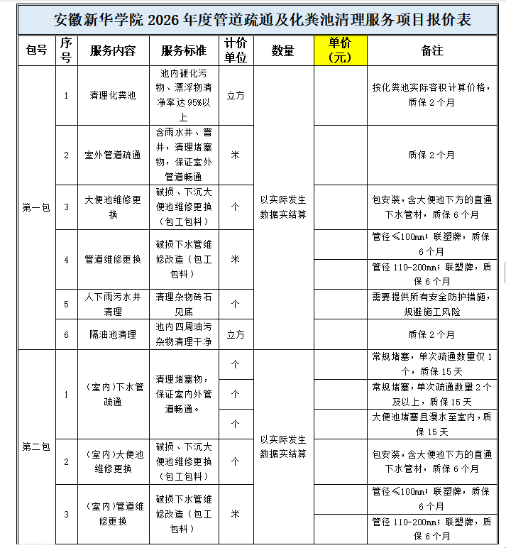 根据工作计划,现对2026年度管道疏通及化粪池清理服务项目进行询价采购,热忱欢迎有资质的供应商积极参与。