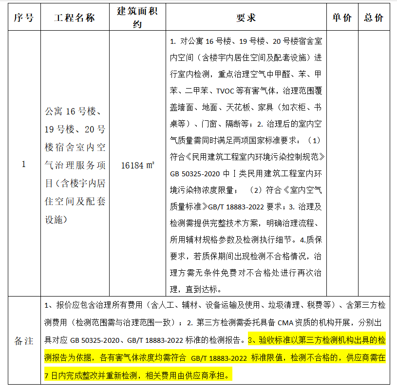 根据工作计划,现对16、19、20幢学生公寓室内空气治理项目进行询价采购,欢迎具有相应资质、有实力的供应商积极参与。