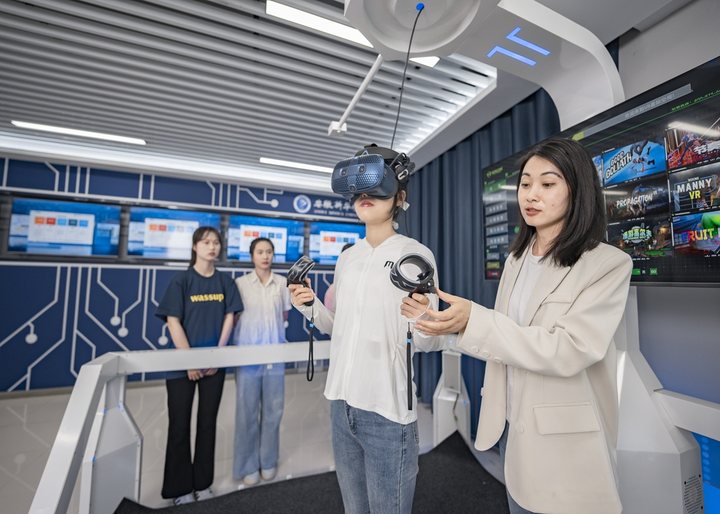 人工智能应用创新实验室突破传统教学实验室的功能边界,以学生创新项目培育为核心定位,通过场景化功能分区构建全周期创新支持体系。实验室按功能划分为成果展示区、VR 作品发布测试体验区、象棋对弈机器人体验区和头脑风暴研讨区四大特色区域。