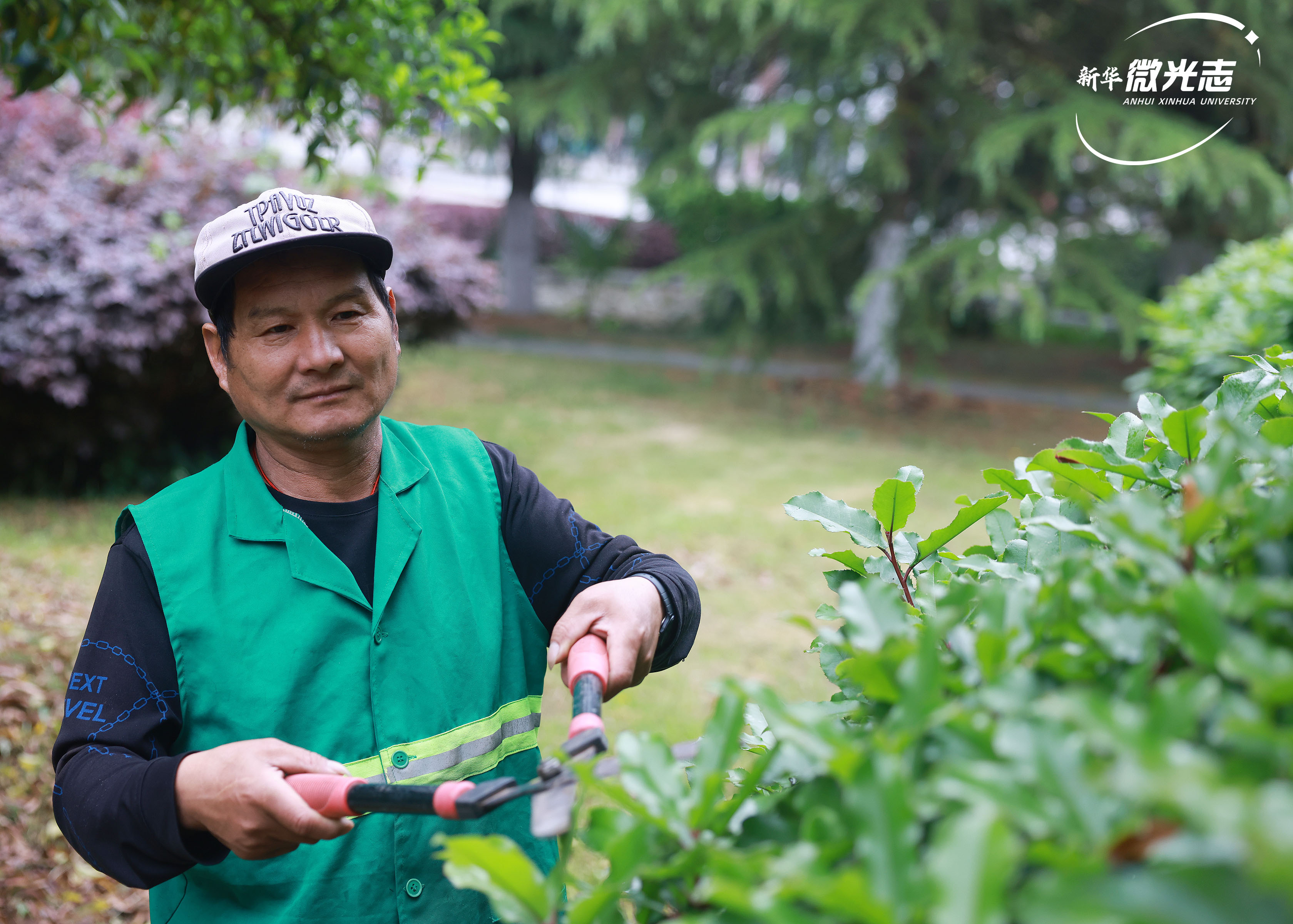 岁月悄然流转,四季轮番更迭,新华园里却藏着不变的风景:春有新枝抽芽,夏有浓荫蔽日,秋有银杏金黄,冬有松柏常青。而守护这份四季景致的,是一道如老槐树般扎根校园的身影——绿化工人郑家付。晨光熹微中,他已在工具间清点农具;夕阳西下时,他仍在草坪旁检查养护情况。十七载寒来暑往,他用汗水浇灌绿意,用匠心守护校园,在“剪枝、浇水、护苗”的平凡日常里,写就了最动人的坚守。