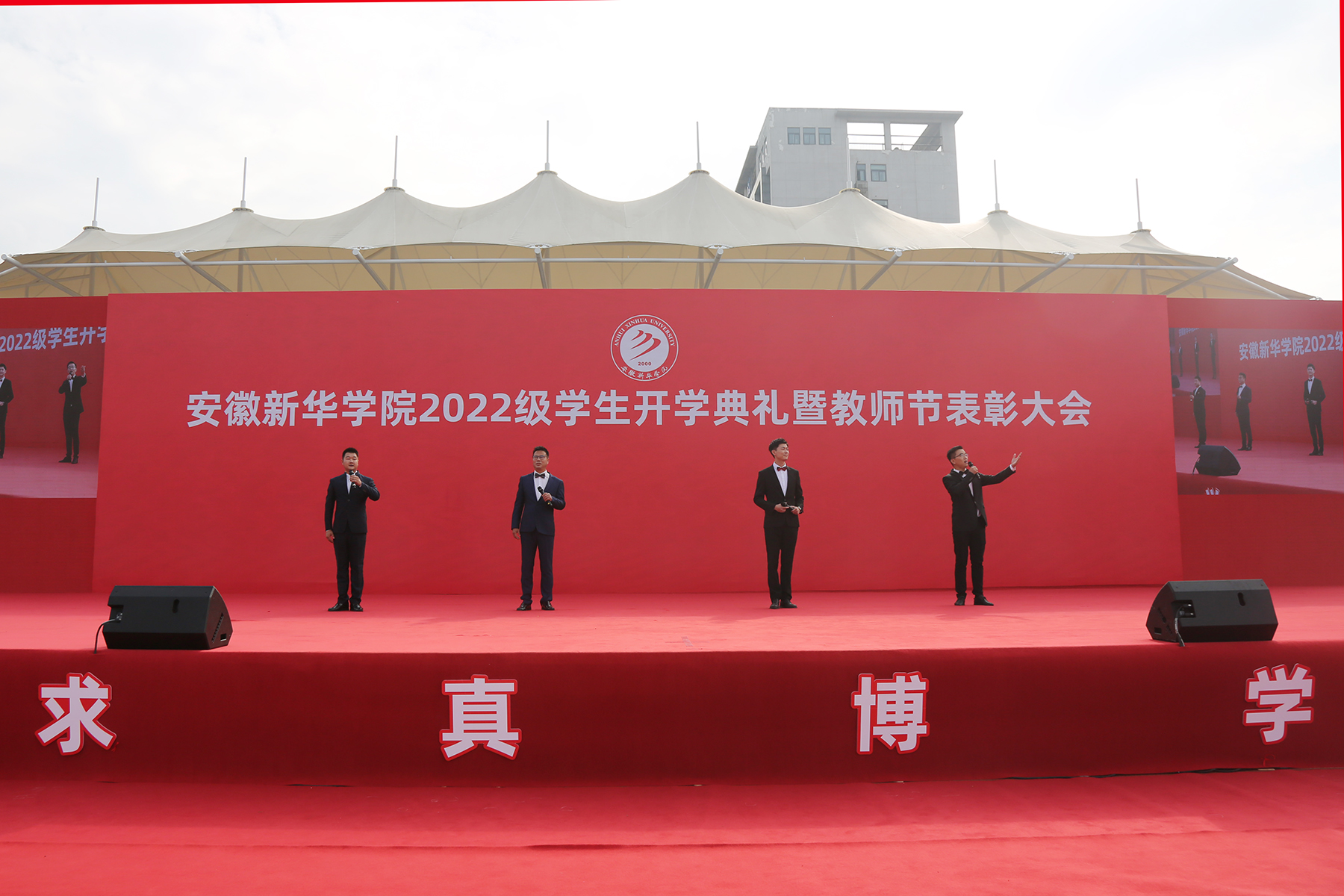 “看那鲜艳的旗帜在蓝天飞扬,扬帆远航风雨担当,描绘美好的世界,贡献中国的力量……”暖场环节,四位老师一首《向往》点燃了不忘初心,追逐新生活的热情。