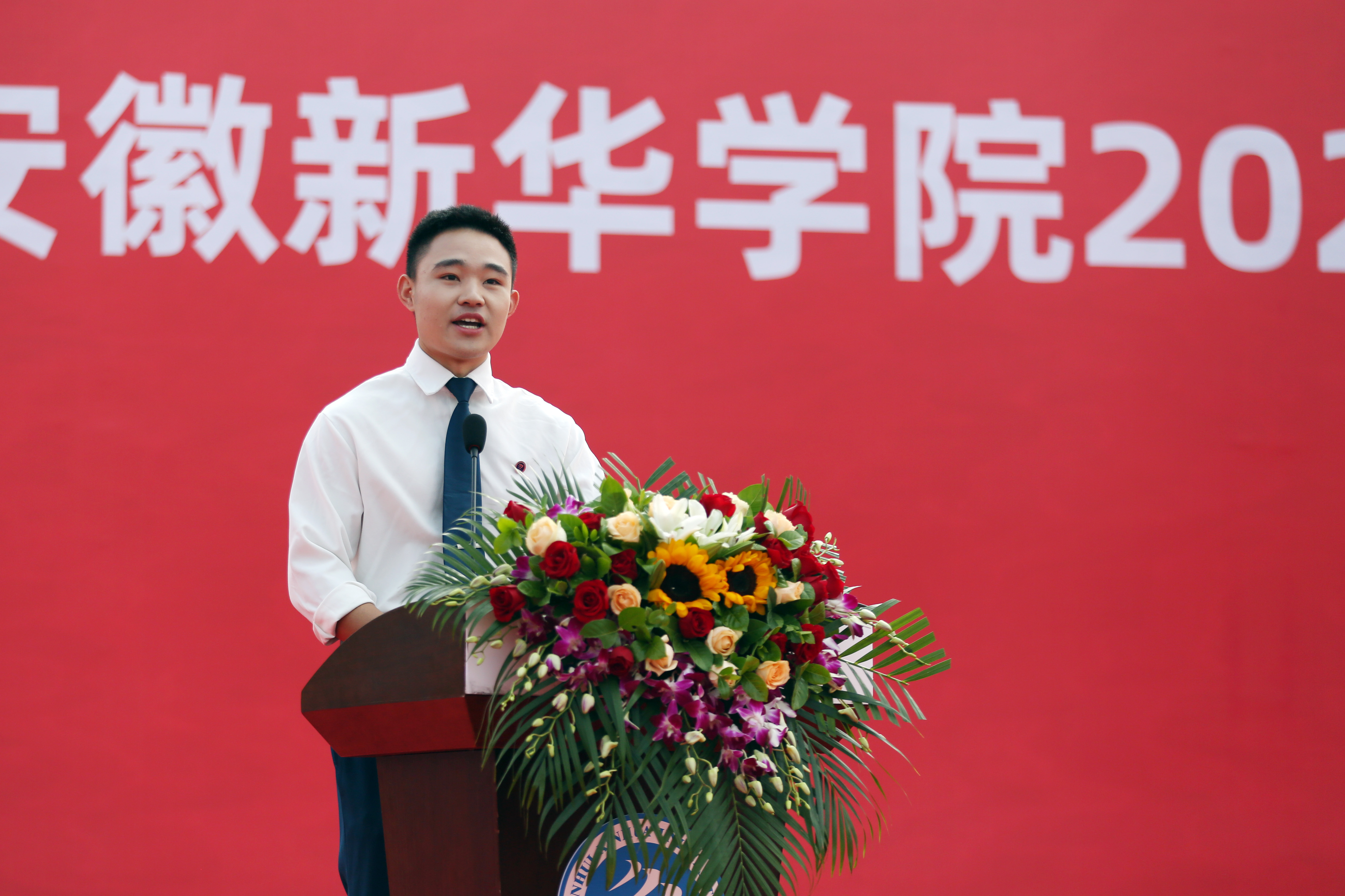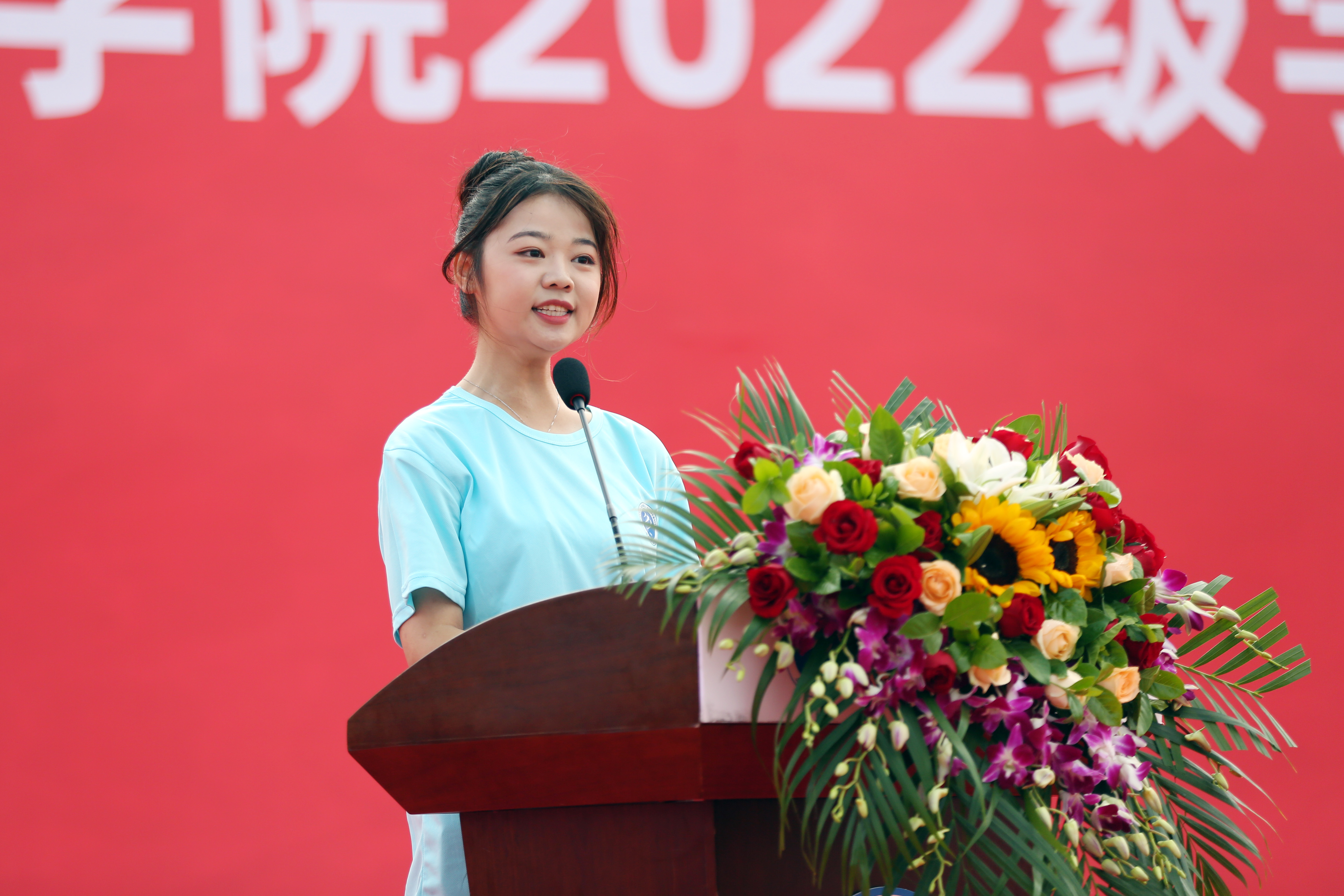 2022级电子工程学院/智能制造学院的薛妍代表新生上台发言。“漫步新华园,我看到了激扬青春风采的祥云体育场,看到了充满诗情画意的秋实路,看到了红墙白瓦错落有致的教学楼……在即将开启的大学生活中,我们将努力践行‘厚德 求真 博学 创新’的校训精神,以敢于挑战极限的勇气,不畏艰难困苦的刚毅,时刻自信从容的心态,去迎接新征程中的无限可能!”
