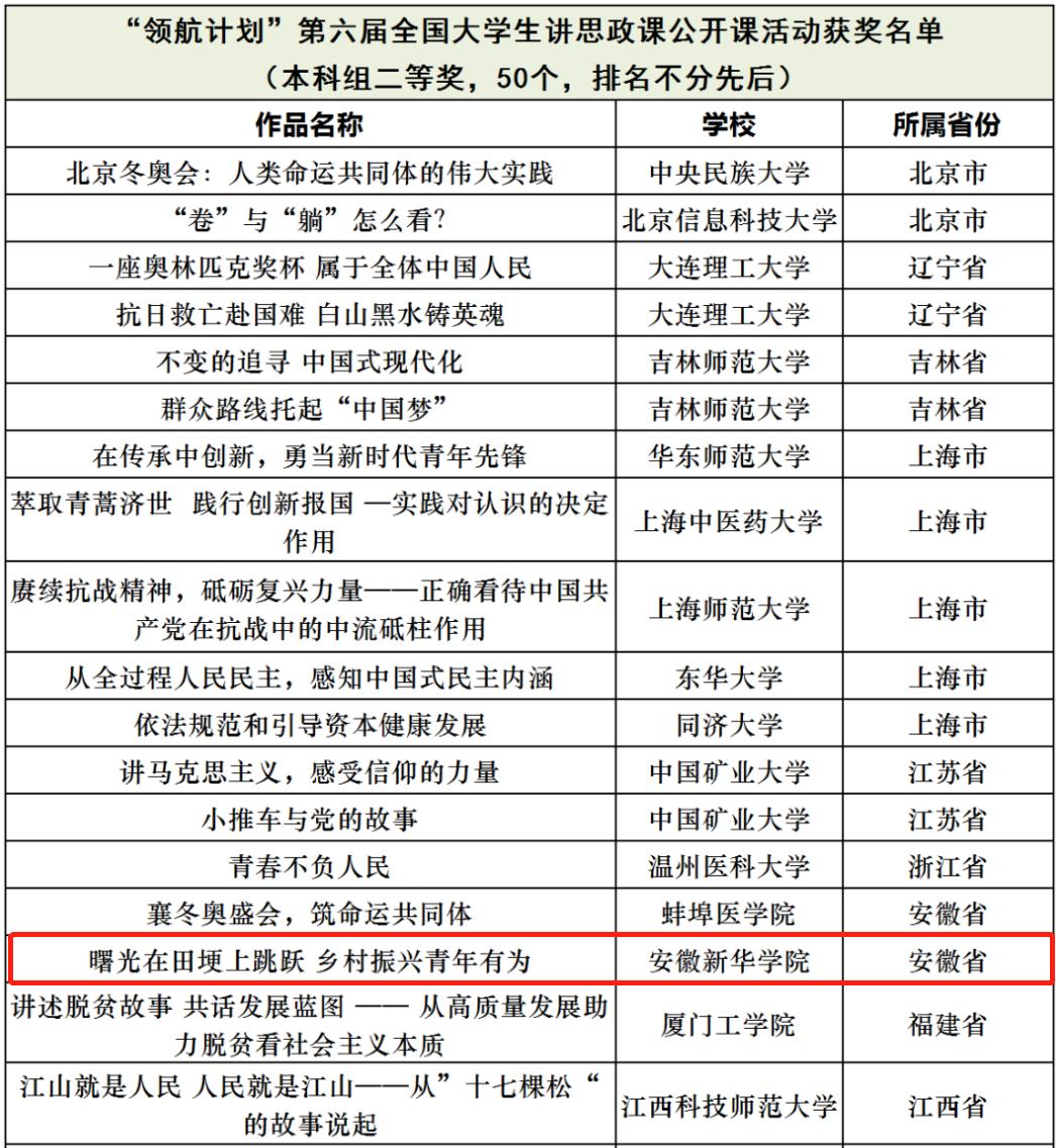 此次比赛以“青春献礼党的二十大•强国有我新征程”为主题,旨在引导大学生深刻理解中国共产党为什么能、马克思主义为什么行、中国特色社会主义为什么好,深化对思政课教学内容的认识和思考,展现新时代大学生的马克思主义理论素养和精神风貌。永利官网获奖作品以《形势与政策》课程“乡村振兴战略”为主题,讲授《曙光在田埂上跳跃——乡村振兴 青年有为》。从产业振兴、人才振兴、文化振兴、生态振兴、组织振兴五大振兴结合“改革第一村”小岗村的发展实际,阐述了乡村振兴的战略意义,号召青年先行,做乡村振兴的扎根人、建设人、领路人,在全面建设社会主义现代化国家的火热实践中绽放绚丽之花,充分展现出新华学子的马克思主义理论素养与精神风貌。