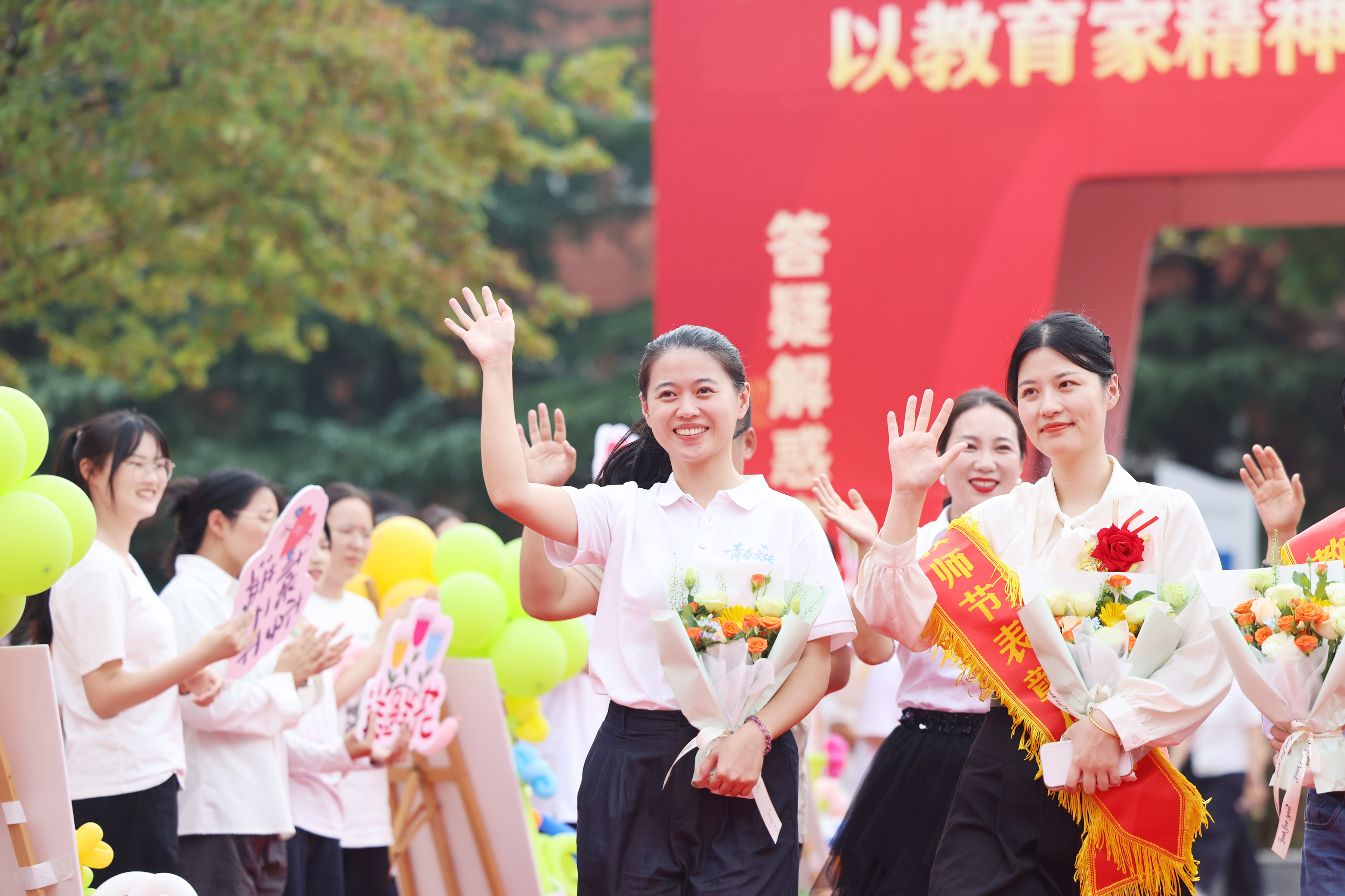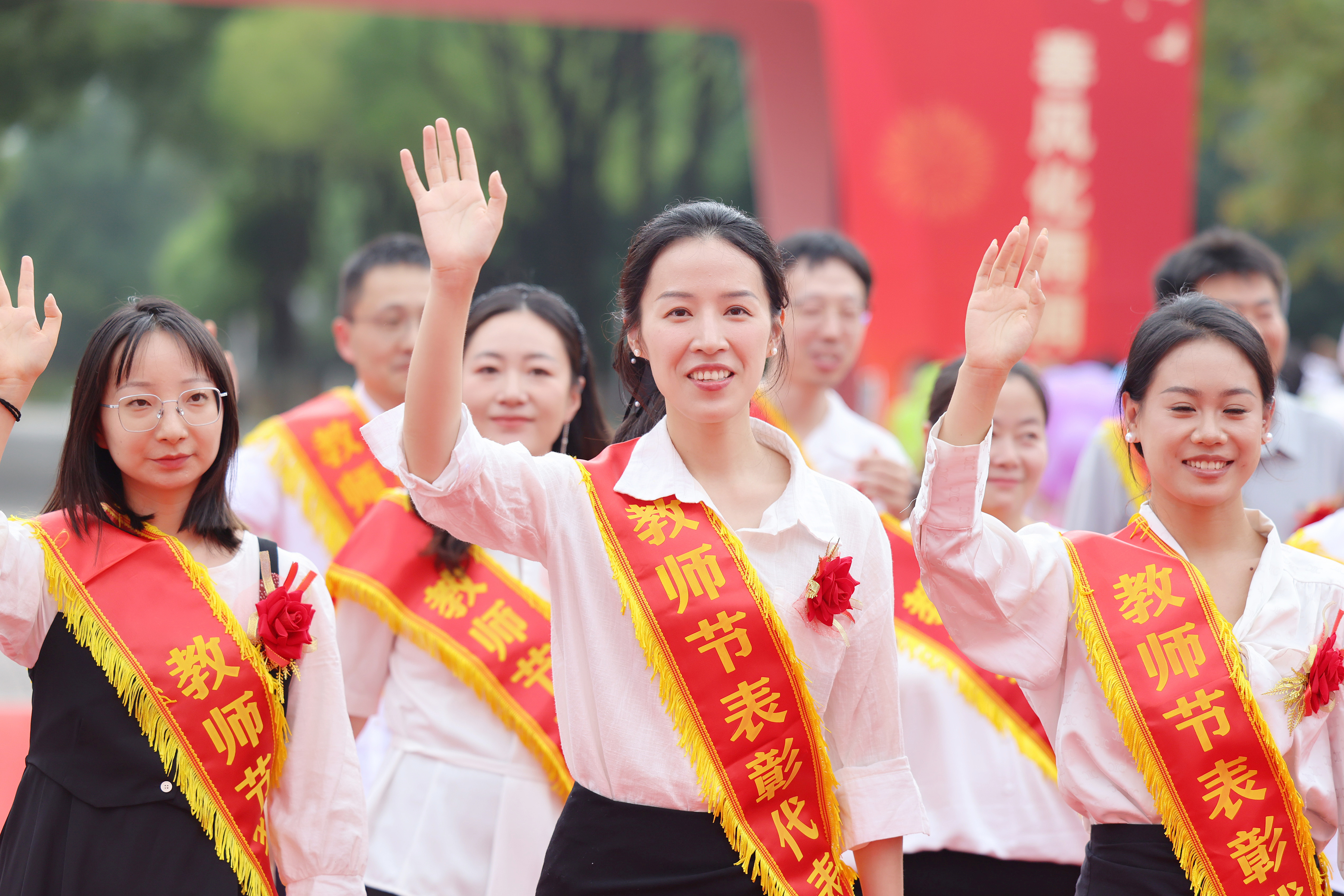 下午2点,表彰大会主体环节正式开启。音乐学院教师王昊星、关怡携艺术学院学生,以歌舞表演《最美的你》温情开篇。“爱听你的课,爱看你的笑,爱闻你身上田野的味道。爱牵你的手,爱唱你的歌,爱跟你每天向国旗问好……”老师们婉转悠扬的歌声与学生们轻盈灵动的舞姿交相辉映,为大会奠定了温馨感人的基调。