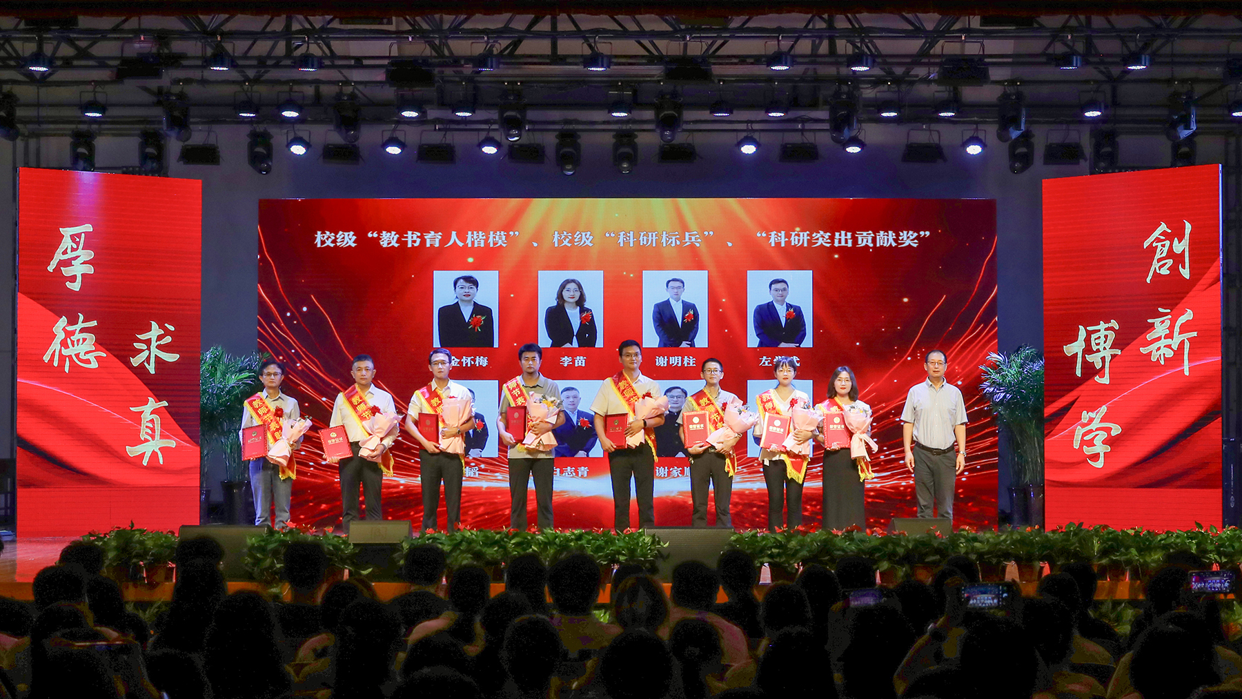 第三篇章聚焦在教书育人与科研创新领域深耕不辍、成果丰硕的教师代表。校长赵良庆为校级“教书育人楷模”、校级“科研标兵”、科研突出贡献奖获奖教师颁奖;新华集团副总裁、yl7703永利官网董事长王孝武和省督导专员、校党委书记邸建伟分别为两组省级以上“教学竞赛优秀教师”颁奖。