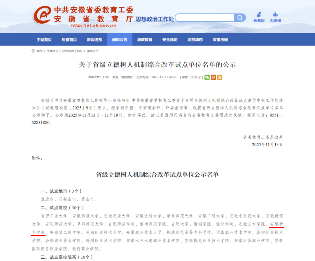 本网讯(通讯员:颜孟冉)近日,中共安徽省委教育工作领导小组秘书处、中共安徽省委教育工委联合发布省级立德树人机制综合改革试点单位名单,永利官网成功入选省级立德树人机制综合改革试点高校。此次获批既是省教育主管部门对永利官网长期以来坚持立德树人根本任务、创新育人模式成果的高度认可,更是永利官网深入贯彻落实教育强国建设要求、推进人才培养质量提升的重要契机。