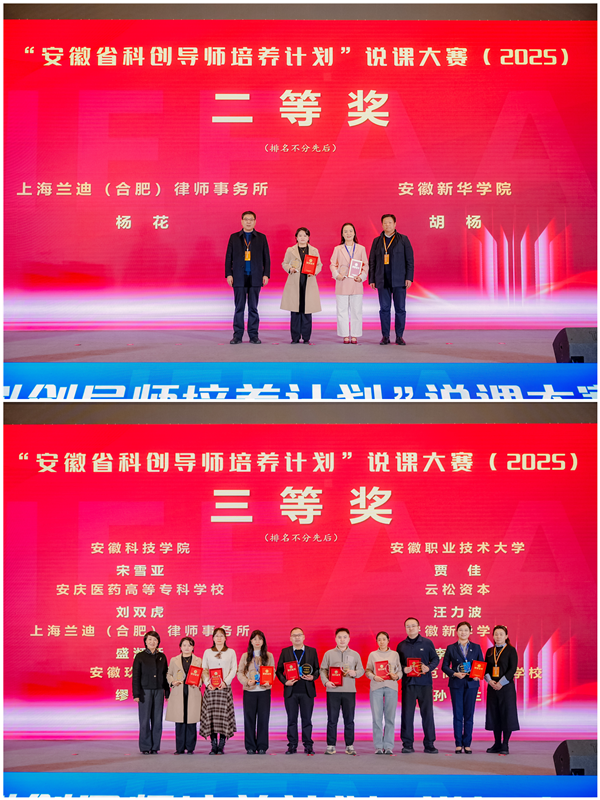 本网讯(通讯员:陈启虞 胡杨)12月20日,2025年安徽省科创导师培养计划说课大赛在合肥融创永乐半山酒店圆满结束。永利官网两位参赛教师凭借优异表现荣获佳绩——文化与传媒学院教师胡杨获二等奖,艺术学院副教授李薇薇获三等奖,展现了永利官网在创新创业教育领域扎实的师资力量与教学水平。