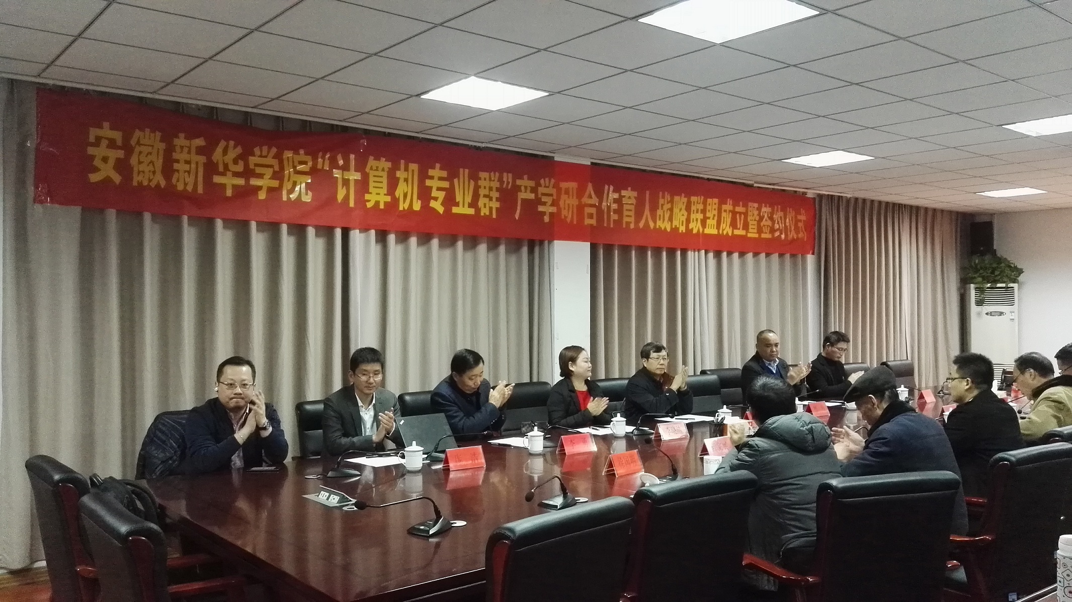 本网讯(通讯员:聂欢欢)12月20日,永利官网“计算机专业群”产学研合作育人战略联盟成立暨签约仪式在第一会议室顺利举行。校长石秀和、中国科技大学教授及安徽计算机学会秘书长徐云、合肥学院计算机系系主任檀明、合肥城市云数据有限公司常务副总经理李晓洁、华信智原安徽分公司总经理李勇、中软国际有限公司安徽分公司经理韦东成、联想安徽分公司经理庞浩、翡翠集团安徽分公司经理吴涛、科研处副处长王琦进、信息工程学院全体管理人员以及部分教师代表参加了仪式。会议由执行院长贺行佳主持。