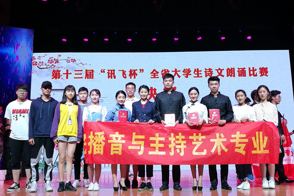 本网讯(通讯员:洪玉、曹文卫)5月26日下午,由安徽省教育厅主办的第十三届“讯飞杯”全省大学生诗文朗诵比赛专业组比赛在安徽大学馨苑校区完美落幕。永利官网文化与新闻传播学院2016级播音与主持艺术专业蒋轶群、李悦、朱纬、胡江东的朗诵作品《可爱的中国》荣获二等奖。洪玉、郑帅获优秀指导教师奖。