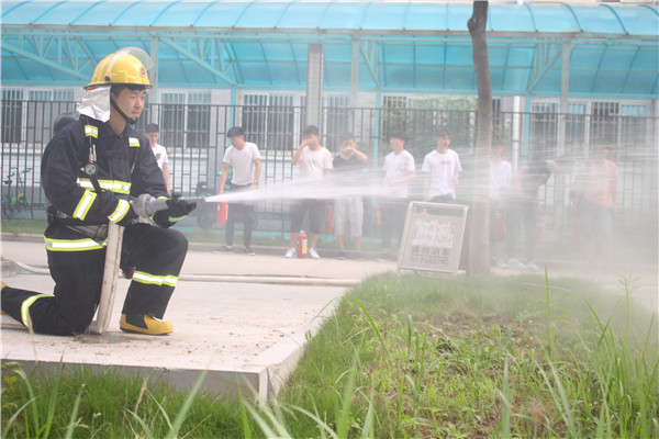 上午9点,演练在科技学院拉开序幕,武英勋宣布消防演练活动正式开始。伴随着火警警笛的阵阵撕鸣与滚滚浓烟,近200名学生弯腰捂鼻、躬身前行,按照规定路线和顺序,快速有序地从教学楼撤离火灾现场。教学楼广场西侧医护人员严阵以待,应急救援人员迅速将“伤员”抬送救治。随后,在教学学楼下,科技学院全体辅导员和部分学生、后勤物业管理人员、大学生治安服务队等200余人积极参与了灭火实战演练。演练中,大家在保卫处干警的指导下,严格按照操作要求实施灭火。