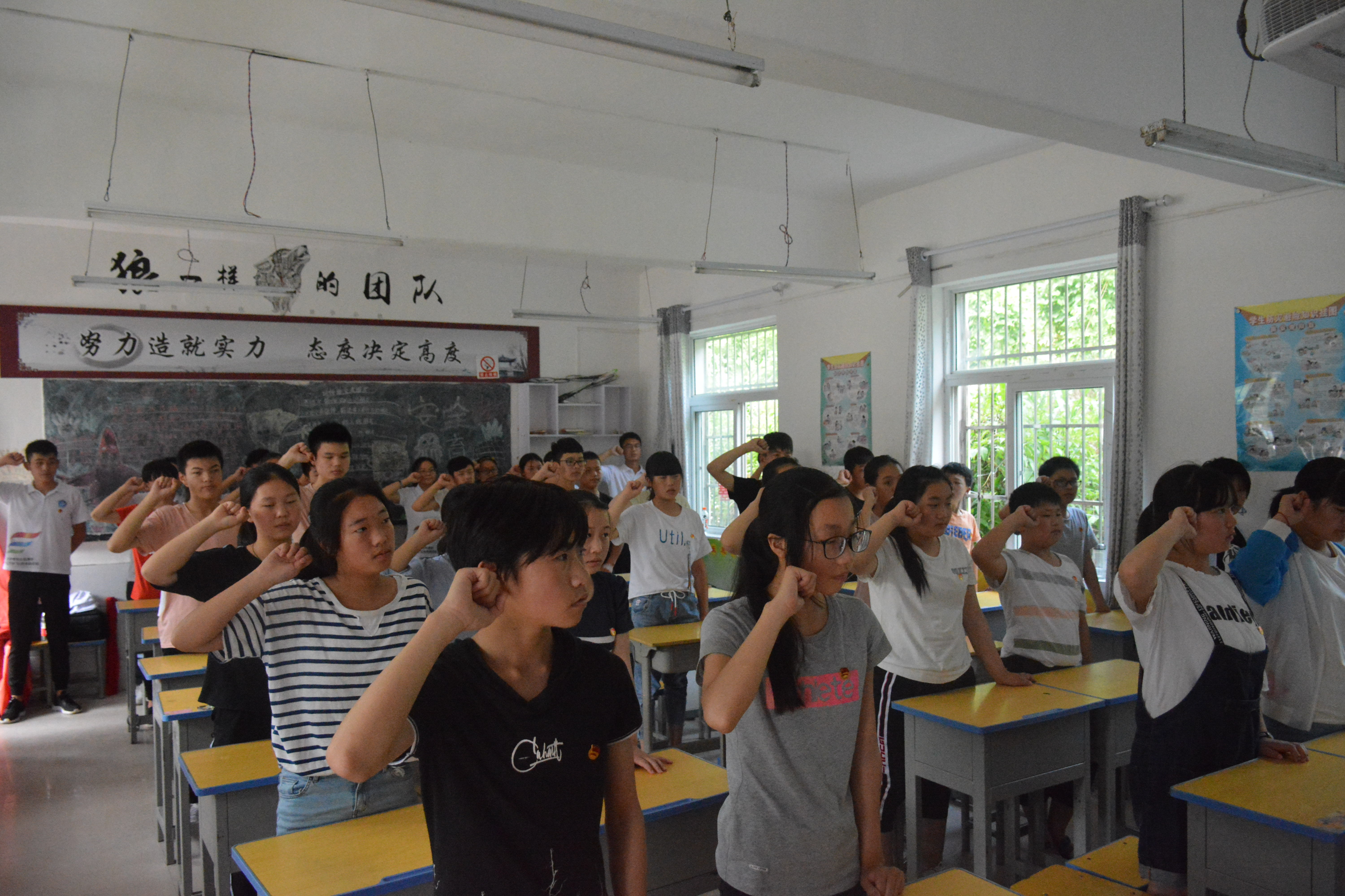 在头陀镇中心学校校领导的带领下,华园青年观察团开始了本次“我的青春,我的梦”主题宣讲。由志愿者张婷婷带领学生们共同回顾共青团发展史,并进行提问交流。学生们踊跃发言,积极阐述自己的理想信念和如何成为一名优秀共青团员的看法。其中朱丹丹同学的发言给了观察团的成员很深的印象,她告诉宣讲人自己的理想是成为一名志愿者,并向同学们呼吁“贫穷并不可怕,可怕的是没有改变的决心”,这一番话赢得了全场掌声。随后,华园青年观察团与学生们一起重温入团誓词,共唱团歌,志愿者们为学生们佩戴团徽。最后,华园青年观察团与学生们合影留念。