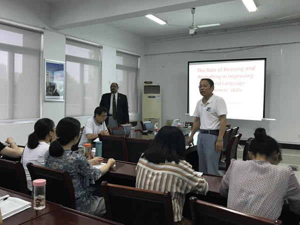 本网讯(通讯员:马兰、盛素雯)7月5日下午,外国语学院新任外教Anwar Moussi博士举行了题为“The Role of Revising and Redrafting in Improving Second Language Learning Skills”的学术讲座。外国语学院院长张杰、副院长王志宏以及全体英语教师共同聆听了本次讲座。讲座由张杰主持。