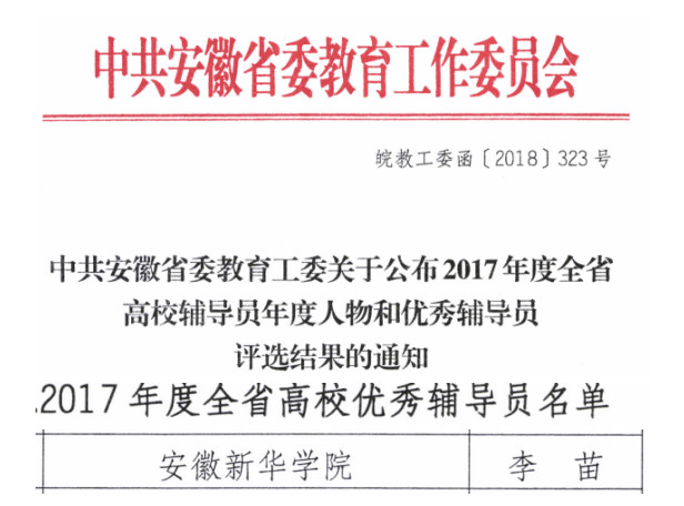 本网讯 (通讯员:李苗) 近日,由中共安徽省委教育工委举办的2017年度全省高校辅导员年度人物、优秀辅导员评选活动结果揭晓。经各高校推荐,中共安徽省委教育工委组织专家评选,共评选出“2017年度全省高校优秀辅导员”25名。永利官网辅导员李苗被评为“2017年度全省高校优秀辅导员”。