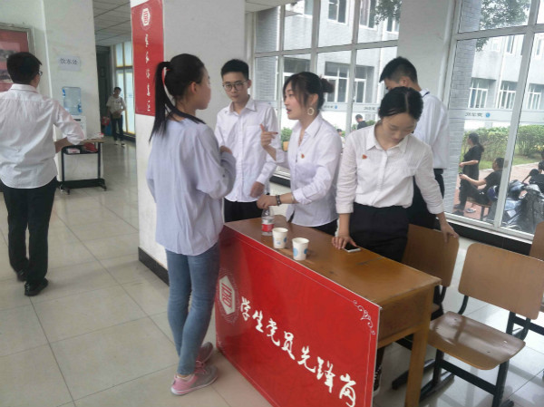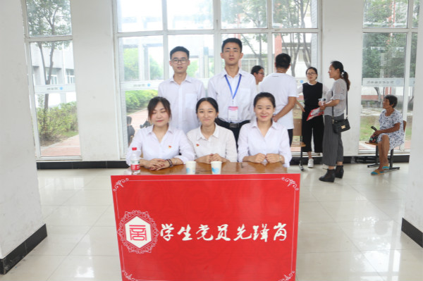 为更好地服务新生和家长,商学院学生党员先锋队在商学院东大厅设立了醒目的“党员先锋岗”。学生党员们统一着装,佩戴党徽,不仅是亮出党员身份,亮出党员风采,更是亮出党员责任。在迎新现场为新生及家长提供入学报到,在校生活,党务等方面等问题咨询。