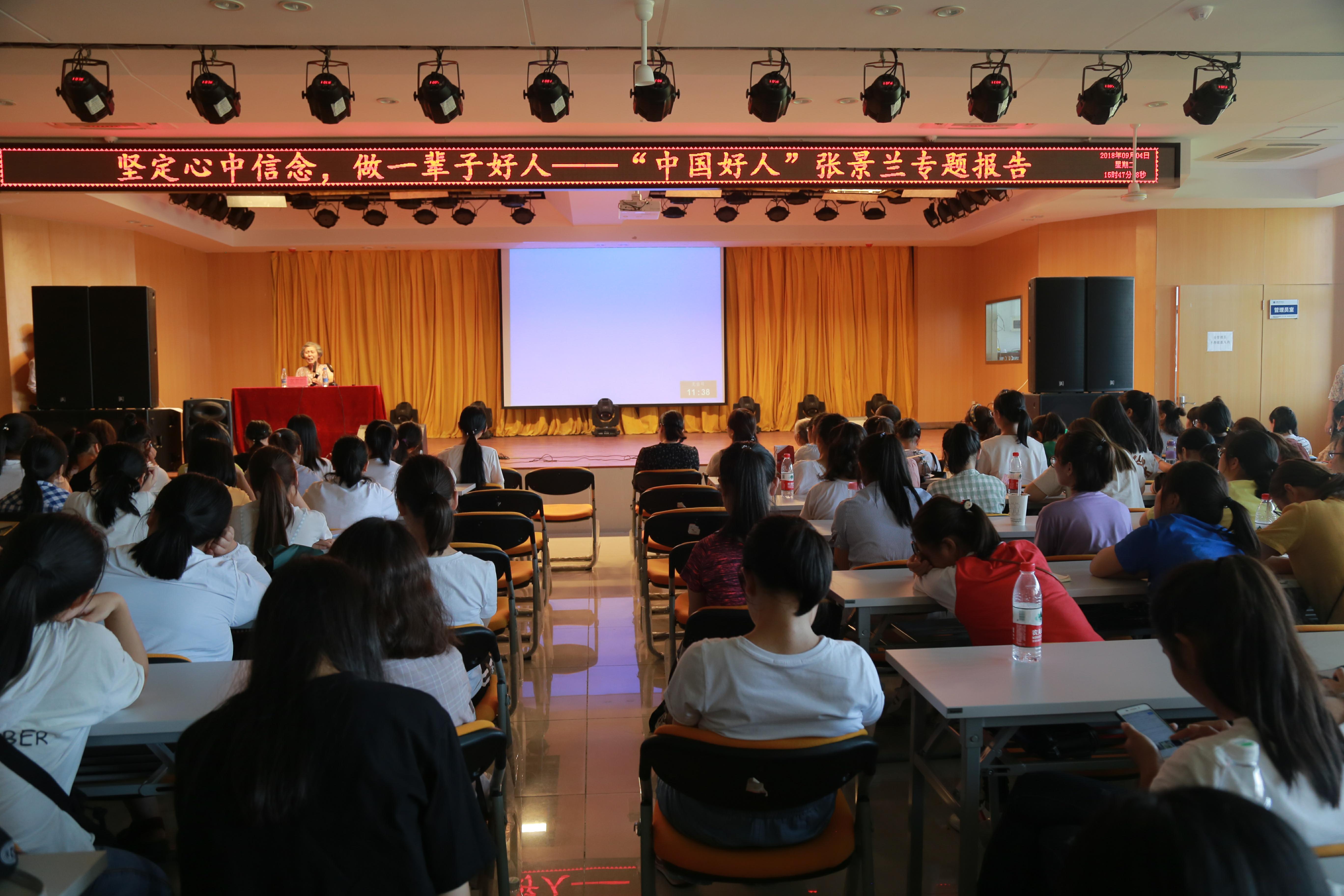 为帮助新生树立正确的世界观、人生观和价值观,外国语学院邀请省人大办公厅退休干部,有“中国好人”之称的张景兰老师作“坚定心中信念,做一辈子好人”的主题报告。在报告会上,张景兰向全体新生讲述了她在传递正能量道路上的所做、所感、所悟,向大家介绍了她资助的贫困儿童情况,以及组建团队将爱心传递的过程,让在场的师生感动不已。