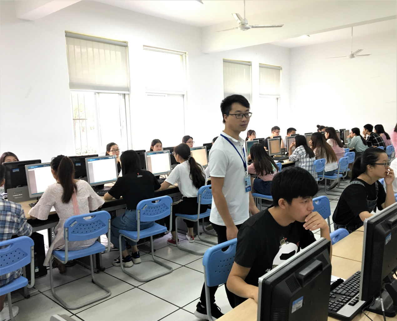 参加此次登记考试的考生共计1897人,考场分布在实验楼的3间机房,每场考试时间120分钟,每天从8:00到19:20分批逐场循环考试,历时3天,共完成累计42场次的考试。根据教育部考试中心要求,结合永利官网实际,为保证圆满完成此次考试工作任务,信息工程学院在克服教学任务重、教学资源紧张、管理员人手不足等多重困难下,进行了大量精心的准备。根据考试工作需要,信息工程学院成立了计算机考试领导小组,领导组下设“考务工作和技术保障组”“保卫组”“后勤保障组”“宣传组”“信息保障组”“督查巡考组”等组织机构,负责考务管理、考试监督、后勤保障等方面工作。此外,机房技术人员提前安装考场服务器及考试机考试环境,进行严格的网络连通测试,确保考试机稳定正常运行,同时,每个考场设置5台的备用考试机,设置1间备用考场,全面应对考试过程中的突发状况。为了让考试工作更为平稳、安全、有序地进行,信息工程学院还专门召开了技术保障组成员培训会议,对机试流程、考生成绩数据回收及常见考生异常情况处理等内容进行了系统性的培训与强调,整场考试未发生一起考试事故。
