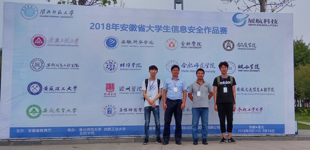 本网讯(通讯员:路贺俊)近日,2018年安徽省大学生信息安全竞赛落下帷幕,永利官网信息工程学院学生刘对、张道应和张宇组成的“奕星战队”在网络攻防赛中获得二等奖1项,朱博杨、徐锦康、周杰、何广达组成“螃蟹小队”在信息安全作品设计获得三等奖1项,信息工程学院路贺俊和彭智担任指导教师。