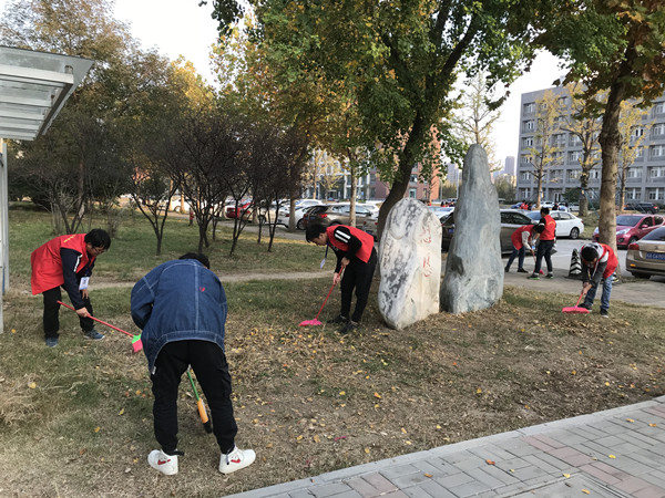 下午,志愿者集合完毕,每个人手持清洁工具,在任务分配后,志愿者对14号教学楼和南侧草坪及附近道路进行了彻底打扫。志愿者们认真清理垃圾,相互配合,有的用铁锹铲除石头砖块,有的用扫帚清扫路面,有的忙着把从草丛中捡出来的废纸、塑料袋等扫进垃圾箱,在萧瑟的秋风中志愿者们认真工作,积极清扫。