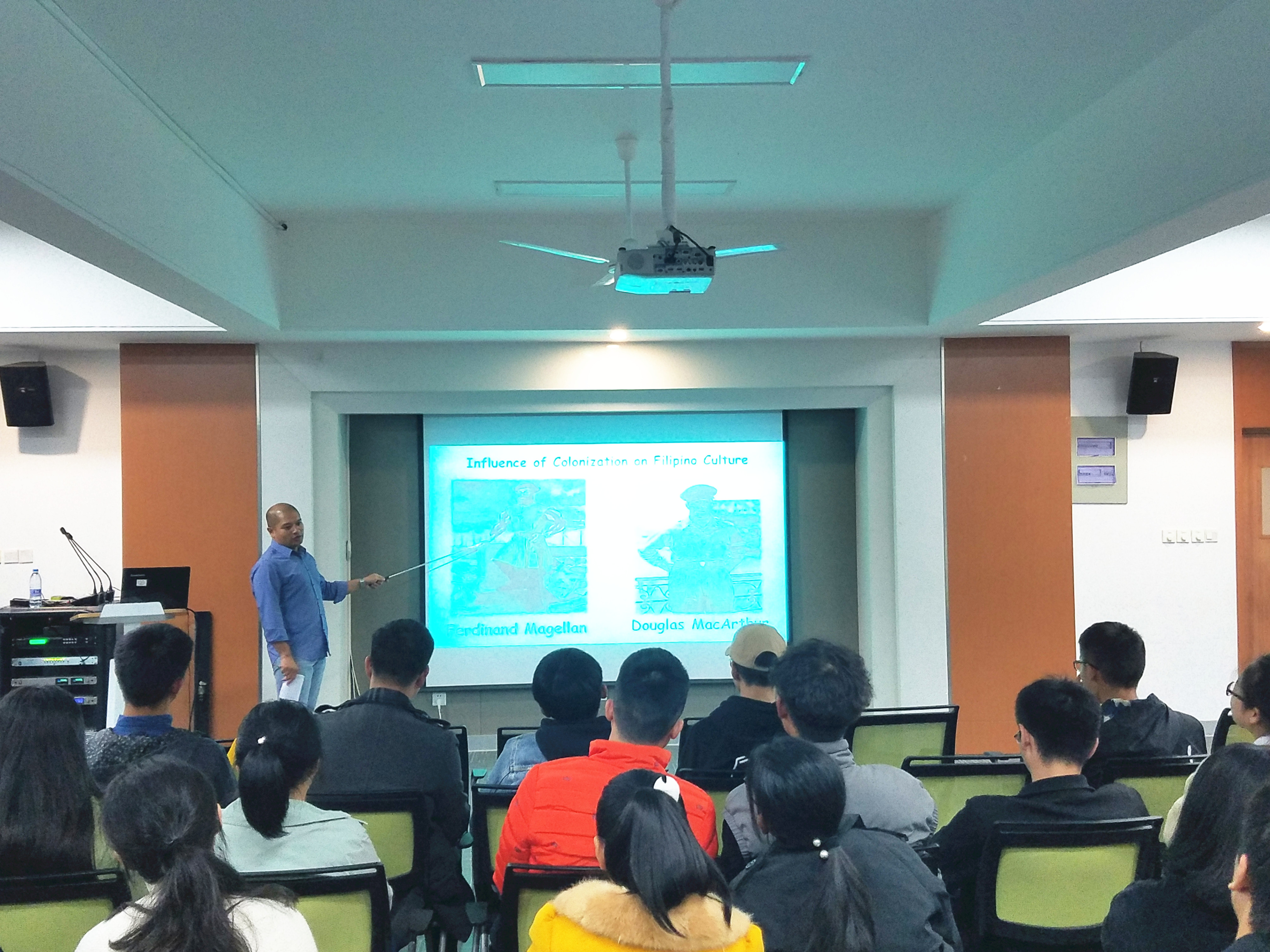 本网讯(通讯员:程欣、周倩)11月12日晚,国际教育学院国际文化节文化系列讲座在多功能厅如期举行。本次讲座的主题为The Influence of Colonization on Filipino Culture。主讲人为来自菲律宾的Eligah老师。