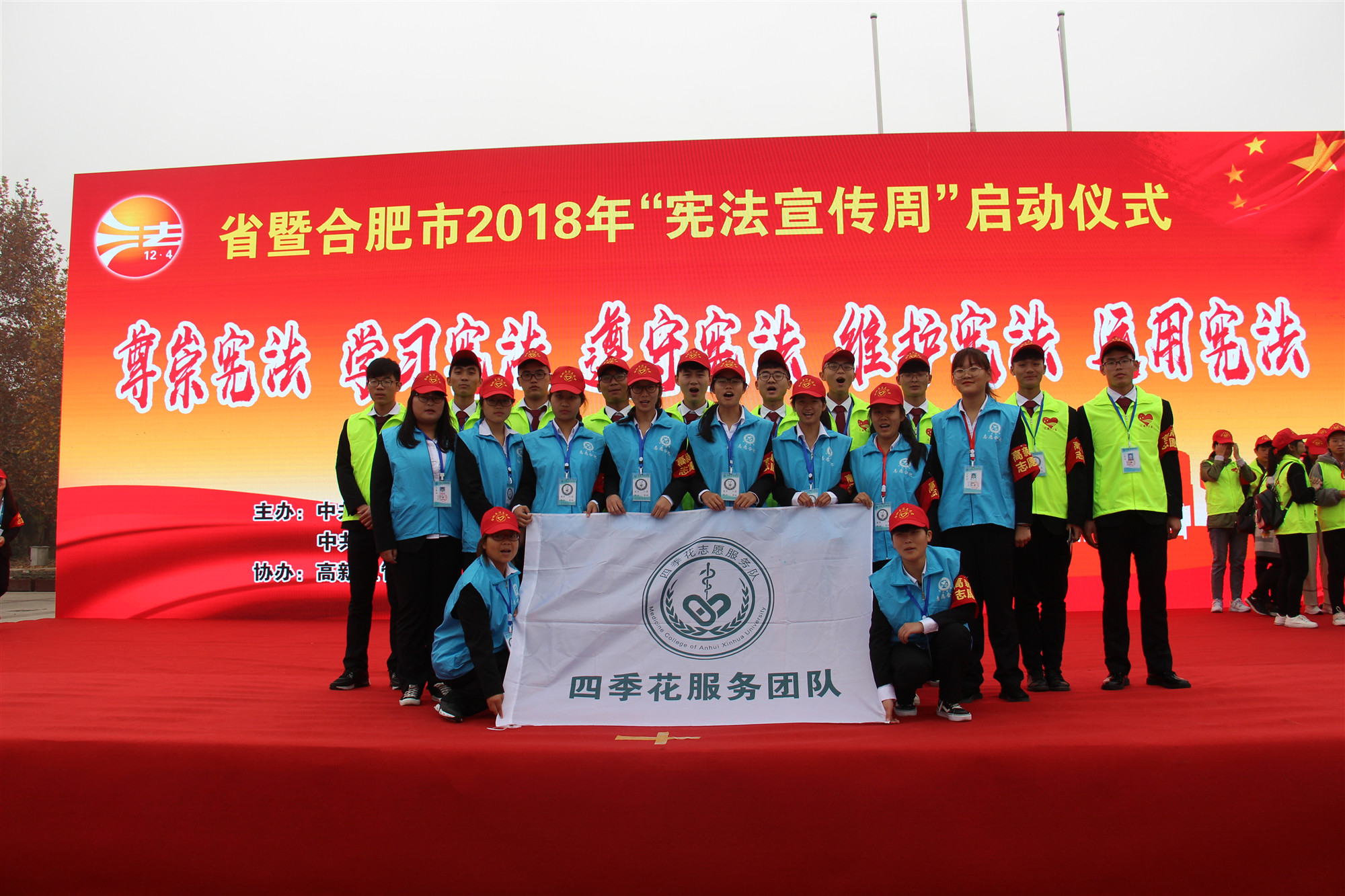 本网讯(通讯员:赵影)12月2日上午,为响应国家号召,积极宣传法治活动,提高全民的法律意识与素质以及全社会法治化管理水平。由中共安徽省委宣传部、安徽省司法厅、安徽省法宣办、中共合肥市委宣传部、合肥市司法局、合肥市普法办、合肥市高新区管委会等联合举办的省暨合肥市、高新区2018年“宪法宣传周”活动启动仪式在合肥市半边街法治广场圆满举行。永利官网药学院四季花志愿者服务团队21人作为普法志愿者参与此次活动。