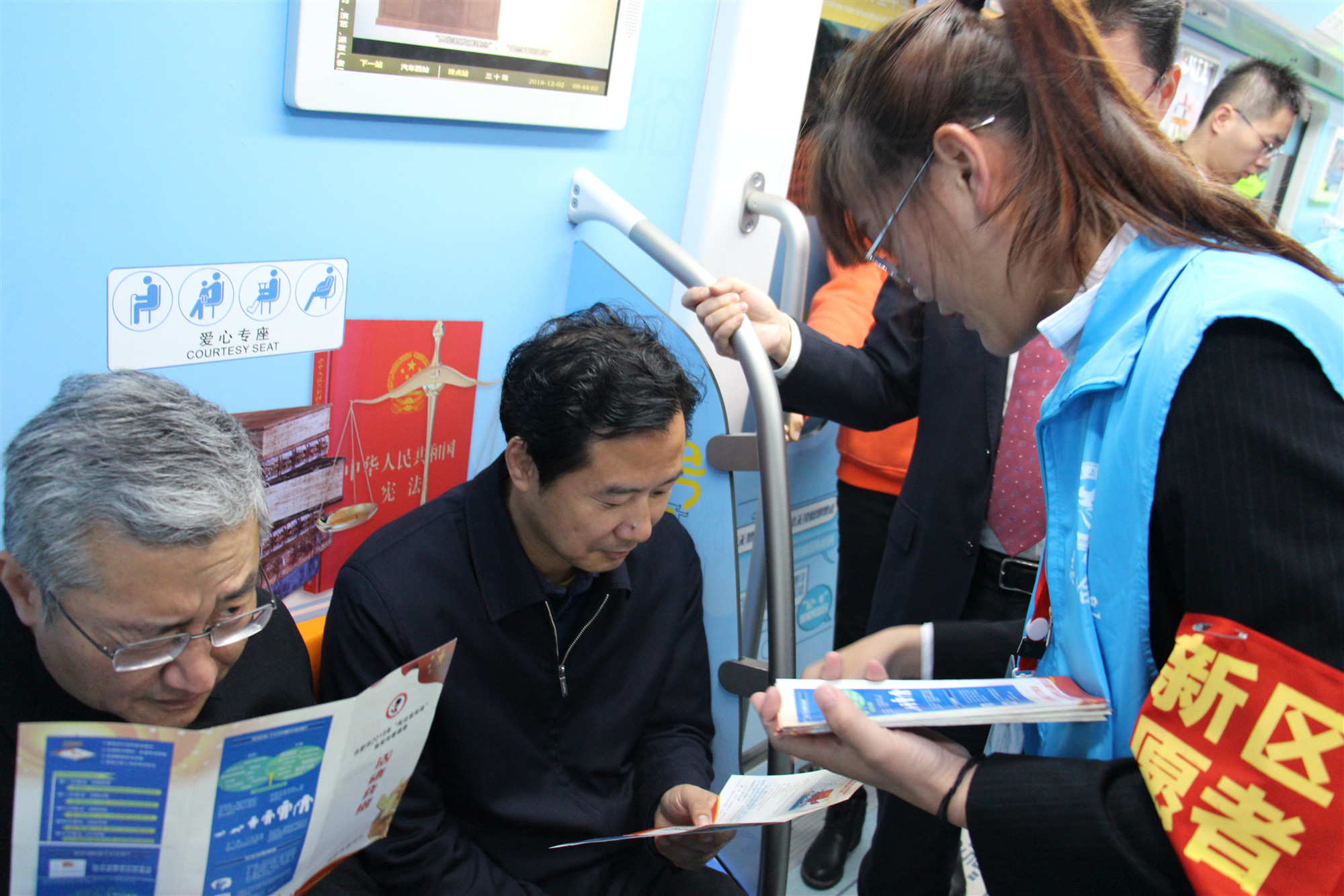 首先,药学院四季花志愿者服务团队乘坐市轨道公司“法治号”地铁专列并在列车中进行宣传单宣传,为乘客们讲解法律知识,并引领他们扫二维码关注合肥市普法官方微信、微博。参会领导巡视法律咨询展台,观看普法展板。活动结束后,药学院四季花志愿服务团队的志愿者们进行了带旗骑行普法宣传。