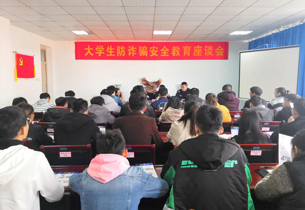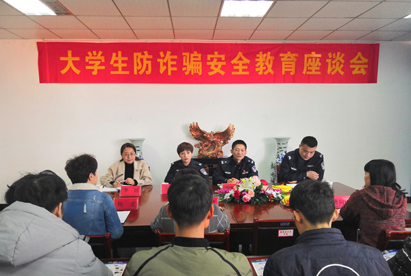 座谈会伊始,韩贺荃、王婷婷分别就冒充QQ好友借钱、网络刷单诈骗、购买网络游戏装备及游戏币交易诈骗、冒充银行客服退货诈骗等常见网络诈骗类型、具体诈骗手段、特点等方面为同学们进行了讲解。顾胜涛结合自己丰富的反诈骗工作经验和典型案例,为同学们分析诈骗案件发生的主要原因、介绍防范电信网络诈骗常识,教给大家如何防范网络诈骗。同学们就如何区分网络诈骗与正常的网络购物,自己身边的网络诈骗,如何更好地开展安全宣传等内容与3位警官们积极互动,警官们耐心细致地解答,并给大家发放了宣传教育材料,现场气氛热烈。老师们也与各位警官就当前学院反诈骗的形势进行了探讨,就安全工作经验作交流,并就后期双方合作开展安全教育工作达成了初步共识。