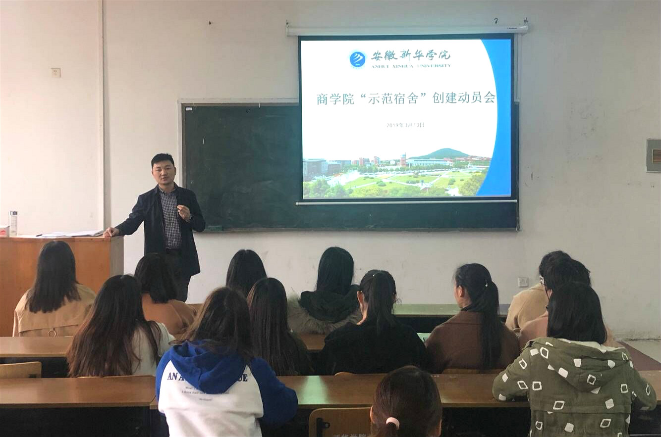 本网讯(通讯员:肖华君)为推进永利官网标准化示范公寓建设,营造文明和谐宿舍氛围。3月14日,商学院召开“示范宿舍”创建动员会,行政副院长吕翔、辅导员代表、9#楼全体宿舍长参加了会议。