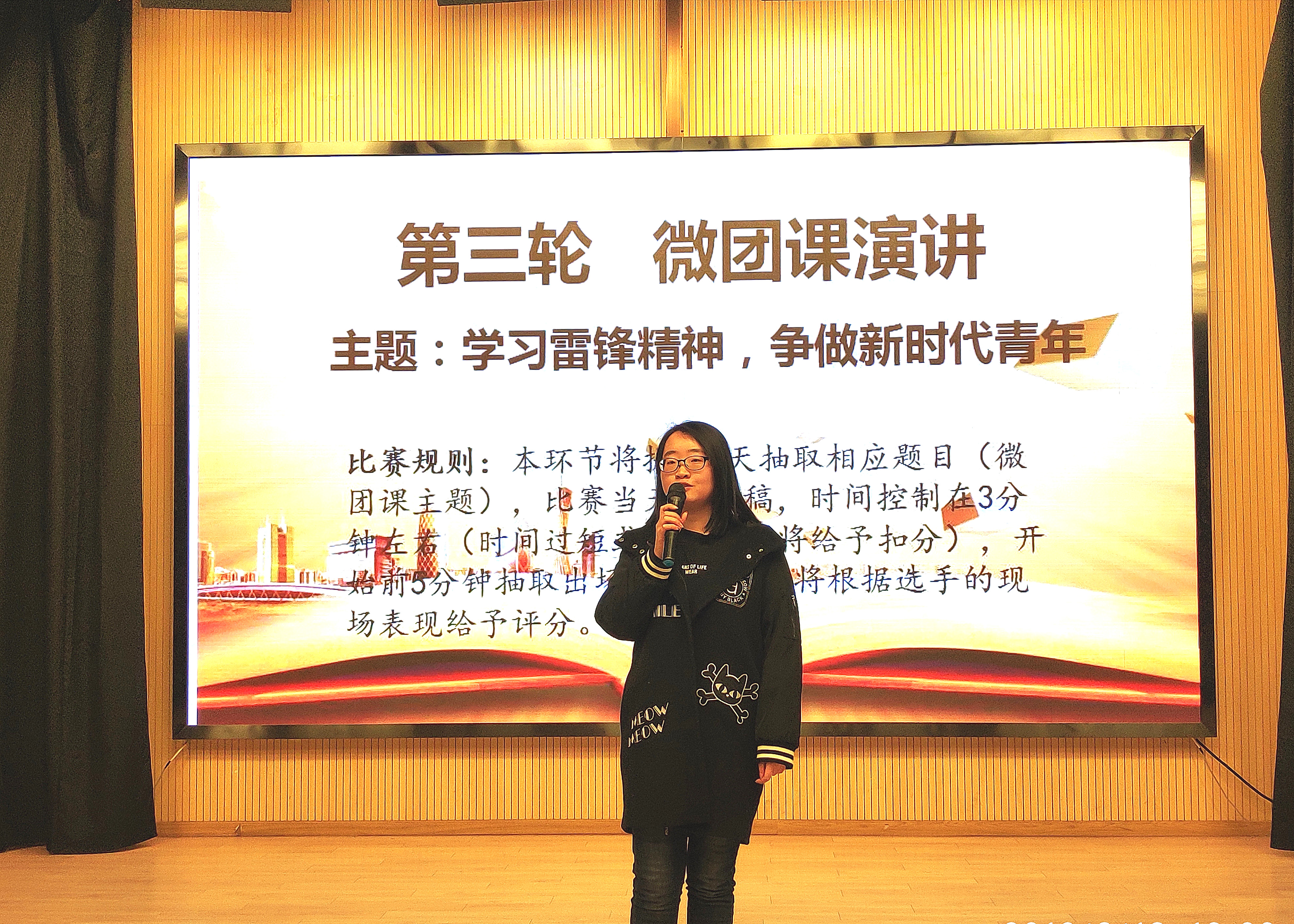 决赛前,团总支根据这6支队伍的实际表现集中进行了培训,着重对比赛规则和要求进行了详细讲解。3月13日晚,决赛在文传演播厅进行,分为理论知识抢答、情景模拟、微团课演讲3个环节。首先,各支参赛队伍选派两名成员参加理论知识抢答环节。抢答环节,所出题目均是大学生需关注的时势热点,队员们快速准确的回答赢得了现场热烈的掌声。随后,情景模拟环节现场模拟团学干部在日常工作、生活中遇到的常见问题。接着,各支队伍以“学习雷锋精神,争做新时代青年”为主题进行微团课演讲,探索“雷锋精神”在新时代的巨大作用。随后,评审人员根据参赛选手的现场表现给予评分并公布了结果。