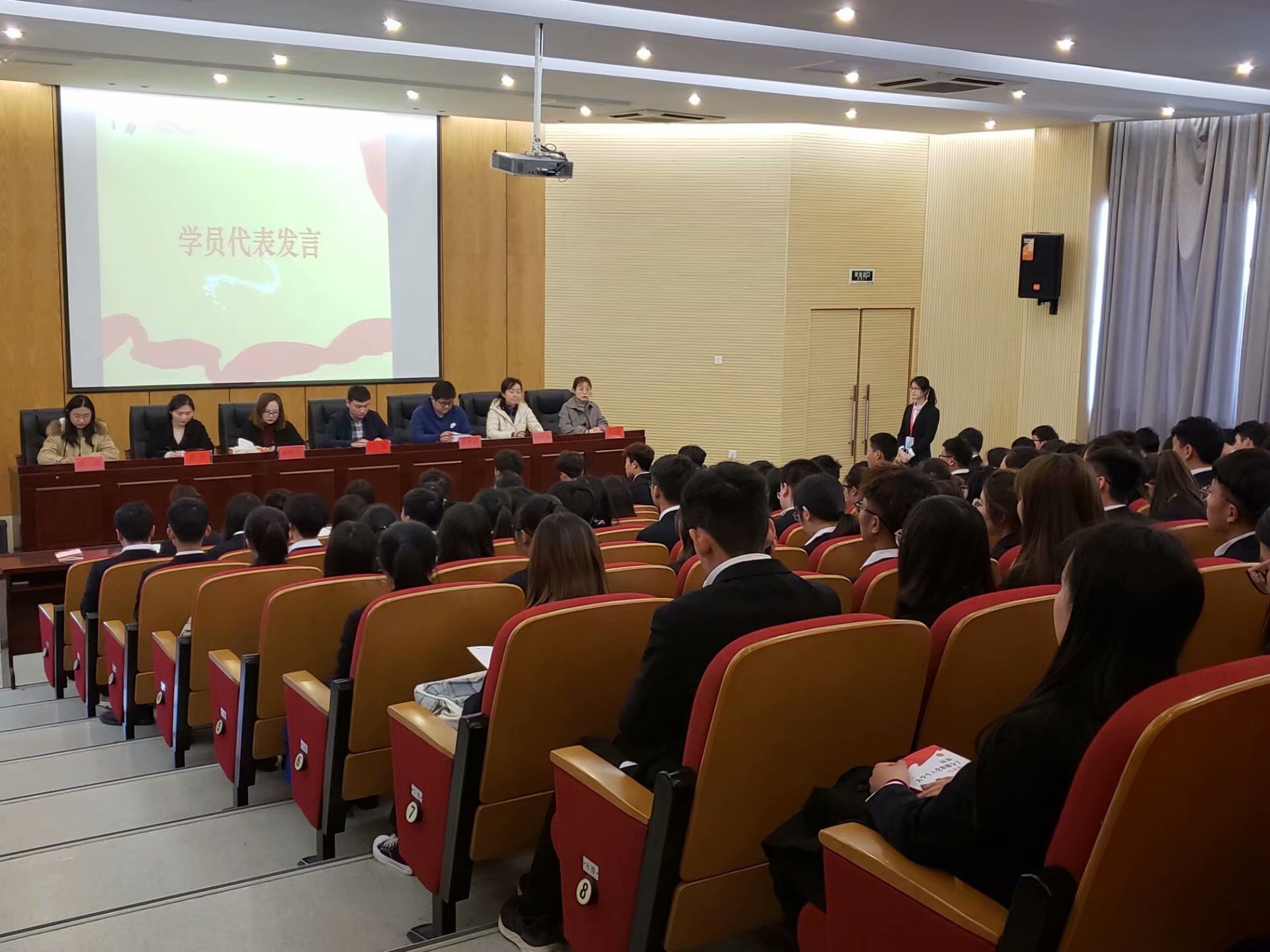 会议开始,全体人员奏唱国歌。学员代表霍雯雯发言,商学院党总支宣传委员肖华君老师宣读党校组织纪律,商学院党总支副书记、行政副院长吕翔作动员报告。
