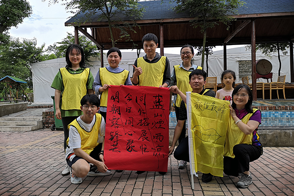 到达拓展场地,体验了农家大锅灶后,团队开展了“破冰起航”活动。小组成员在规定时间内拟定队名及口号,完成队徽的绘制。随后各组依次进行了队歌的表演和团队造型的展示,活跃全场气氛。