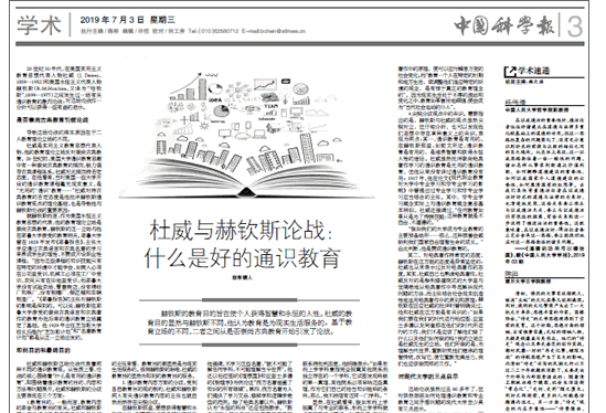 本网讯(通讯员:林斗秀)7月3日,《中国科学报》刊登了永利官网大学生素质教育中心研究员朱镜人教授的《杜威与赫钦斯论战:什么是好的通识教育》一文,该文从是否崇尚古典教育、即刻目的和最终目的以及对现代大学的启示进行了阐述。现将原文转载如下。