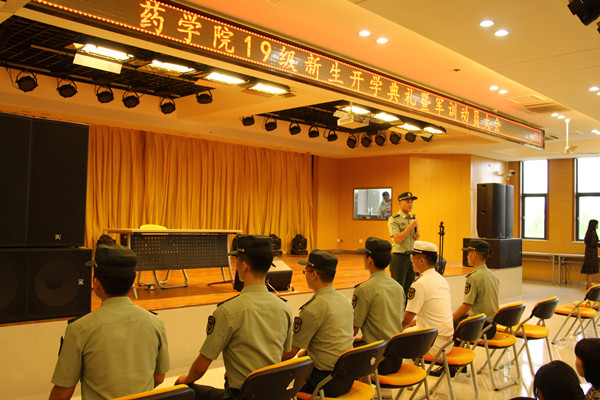 本网讯(通讯员:赵影)为欢迎2019级新生,加强爱国主义教育,提高国防意识,掌握军事知识,提高大学生体能素质,药学院在学校统一安排下,面向2019级新生开展军训活动。9月2日下午,药学院在小礼堂举行2019级新生开学典礼暨军训动员大会。出席此次大会的有药学院执行院长黄德垚,药学院副院长余立新,药学院院长助理陶阿丽,药学院教授代表刘自平,宋祖荣副教授,药学院学管秘书赵影,七营全体教官,2019级各专业辅导员,以及2019级药学院全体新生。