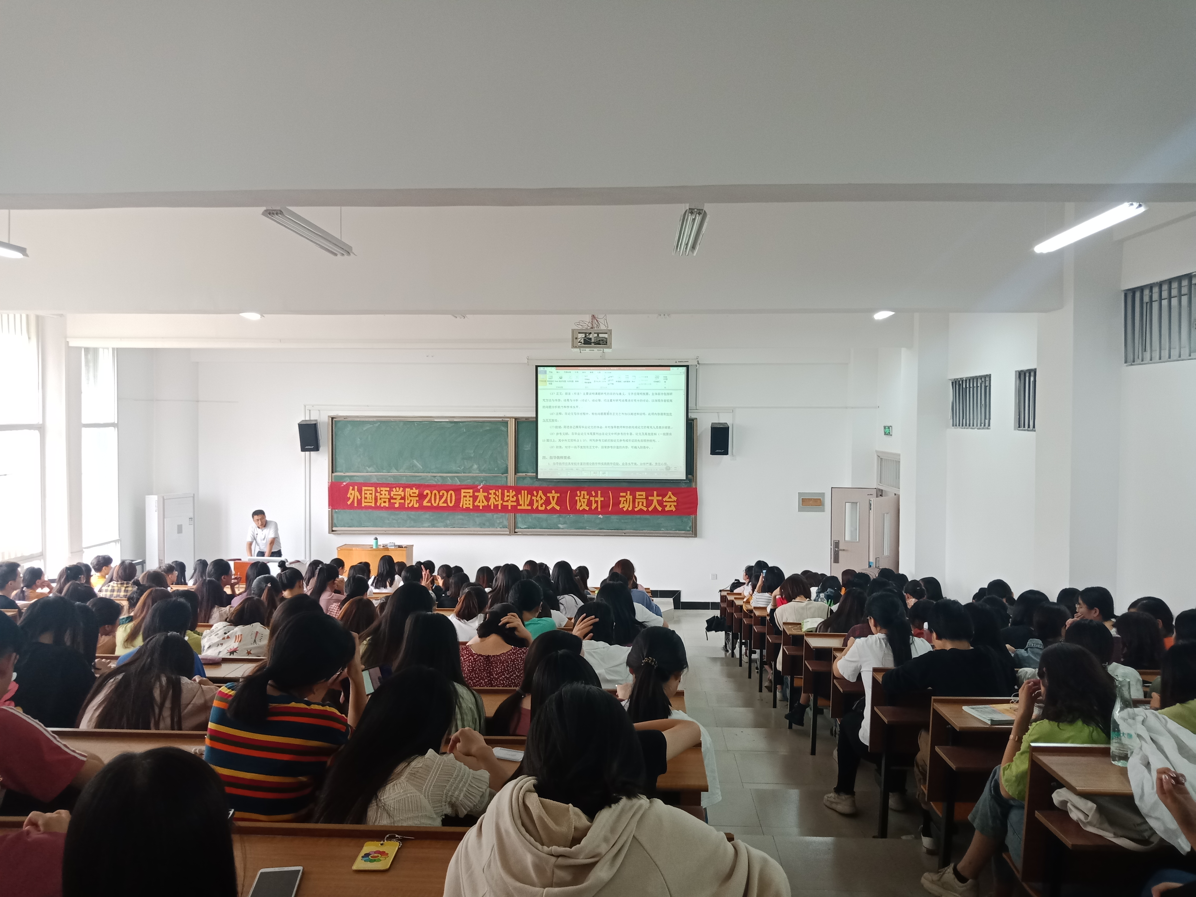 本次论文动员大会拉开了外国语学院2020届毕业论文工作的序幕,让指导教师明确了论文指导职责,学生们了解了毕业论文工作的重要意义,清楚了各阶段工作规范要求和任务,为毕业论文工作的圆满完成奠定了基础。