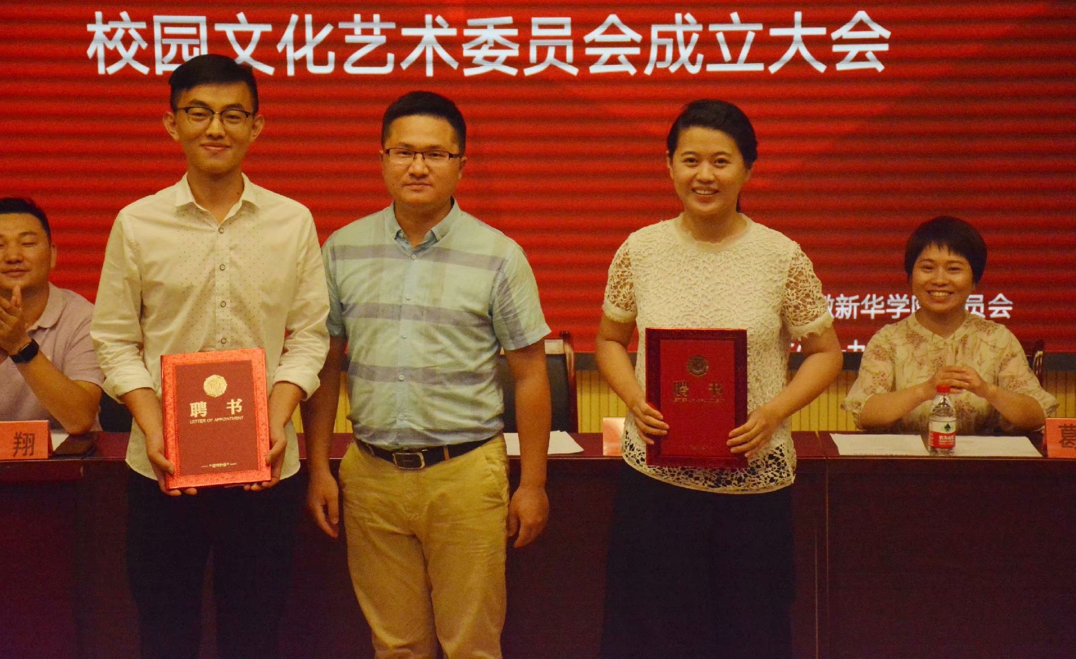 大会在庄严的国歌声中拉开帷幕;首先,王飞宣读了《关于成立yl7703永利官网校园文化艺术委员会的通知》,接着由何亚梅、吕翔、葛云、贺行佳分别为不同组别的文化艺术指导教师颁发聘书。随后,受聘教师代表黄梦发言,他表示作为校园文化艺术指导教师要做到围绕中心,服务大局;积极创作,努力创新;齐心协力,共同发展。