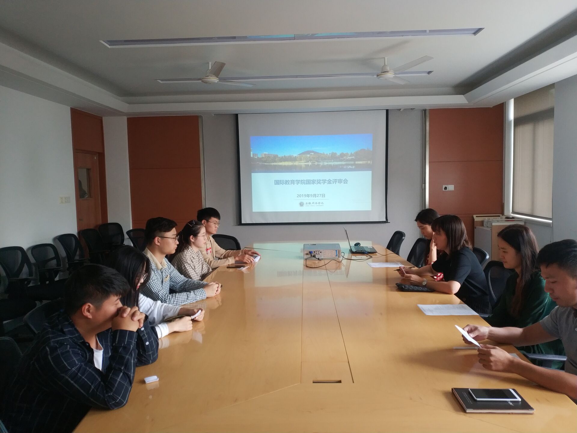 本网讯(通讯员:汪涵涵)9月27日,国际教育学院2019年国家奖学金评审会议在会议室召开。国际教育学院院长助理周倩、全体学工人员及参与评选汇报的学生参加了此次评审会,会议由行政兼学管秘书汪涵涵主持。