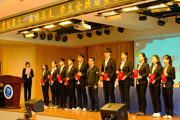 聘任环节中魏高莉宣布了第十一届团总支、学生会干部聘任决定,谢汝强为团总支、学生会受聘干部颁发聘书,朱诵贵为主席团干部颁发聘书。