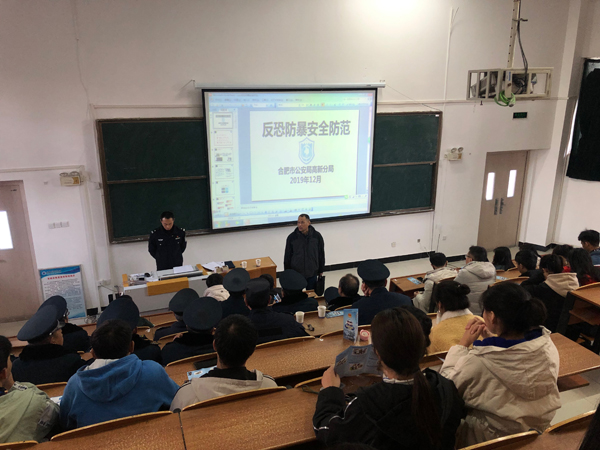 本网讯(通讯员:张迎)2019年12月4日下午,永利官网在商学院218多媒体教室举行了“反恐反暴,安全防范”校园安全防暴反恐知识讲座,特邀合肥市高新分局警官李伟授课,学院保卫处全体人员、护校队和消防志愿者大队部分骨干参加此次活动。李伟详细的介绍了什么是恐怖主义、如何识别恐怖袭击行为,列举了近年来发生的一些实例,最后还重点讲解了在高校校园遇到暴恐袭击怎么办以及如何抵制恐怖主义思想传播。