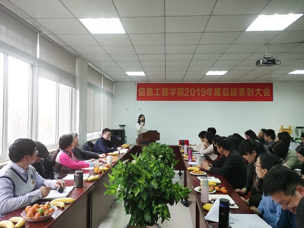 大会首先由胡晓天、李苗、姚丽莎、许梅四位教师代表分别从如何做好学科竞赛工作、如何做好学生管理工作、如何做好科研工作和如何做好计划外招生工作进行了经验分享。其次,盛晓青做了信息工程学院2019年工作总结,并介绍了2020年重点工作计划。接着,学院对“首届课程设计大赛院级赛”获奖者、信息工程学院“2019年度优秀党务工作者”、信息工程学院“2019年度先进教育工作者”进行了表彰。最后,万家华带领全体教职工学习了《yl7703永利官网教师聘期考核管理办法(试行)》,并对近期教科研工作进行了布置,盛晓青对寒假值班进行了布置和要求。