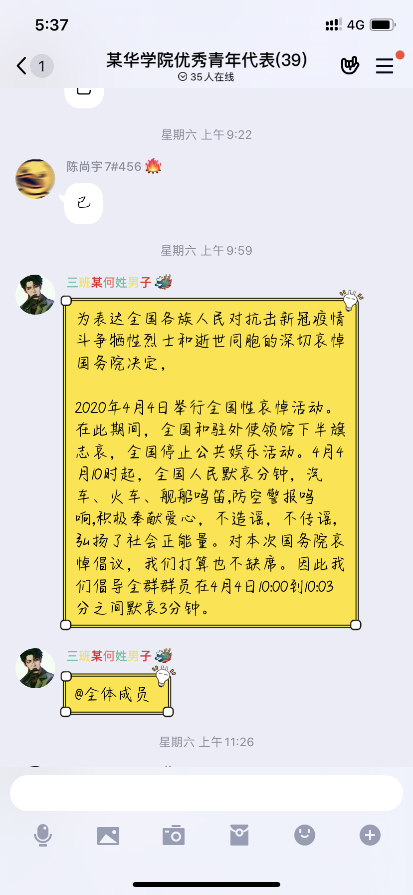 学生们积极响应国家的号召,自发地组织了一些哀悼方式。有些同学在公祭日当天将自己的QQ头像换成黑白色;有些班级自发在群里转发哀悼消息,组织同学默哀3分钟;有些同学积极评论全国哀悼活动。