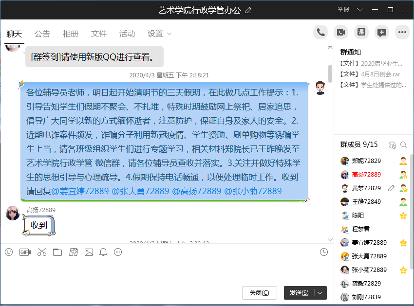 清明节前,艺术学院召开专题工作布置会,要求全体辅导员召开假期安全主题班会,引导同学们网络祭祀、居家追思,不外出、不聚会、不扎堆,倡导广大同学以新的方式缅怀逝者,特殊时期,保证安全;在清明节后要求全体辅导员对学生假期动态做统计汇总,做好动态跟踪摸排,以掌握学生的实际安全状况。