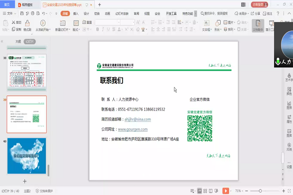 安徽省工业设备安装有限公司人力资源部主管余敏,通过与毕业生线上视频的方式,在线为毕业生介绍公司的概况、职业发展方向、人员需求以及选择该单位的理由;还表明有意向的同学可以添加主管微信,更详细的去了解公司的状况,更可以预约视频面试。公司项目广泛,与学院众多专业对口,急需给排水、土木工程、安全工程、工程管理等专业的人才。