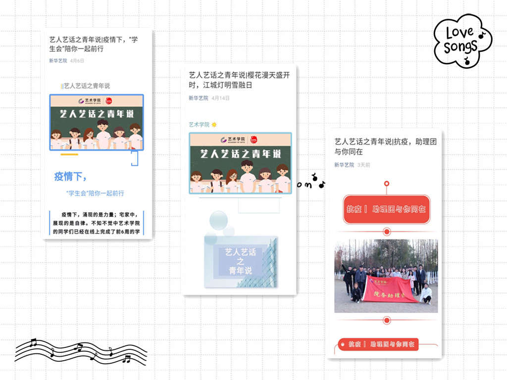 活动通过第二课堂平台“PU口袋校园”发布,广大同学们积极响应,投稿内容类型多样:有学生组织温暖陪伴的告白、有抒情个人情感的诗歌散文、有专业的艺术创作、还有学习之余的所感所想;截至目前,“新华艺院”已连续三周,每周一期推送了3篇原创文章:《疫情下,“学生会”陪你一起前行》、《樱花漫天盛开时,江城灯明雪融日》、《抗疫,助理团与你同在》,上述3篇文章同属“战疫”系列文章,无论是学生组织还是学生个人的文字中都透露出新时代青年向上的精神面貌,言辞中更是透露出新时代学子们在特殊时期的家国情怀,读者反馈效果较好。