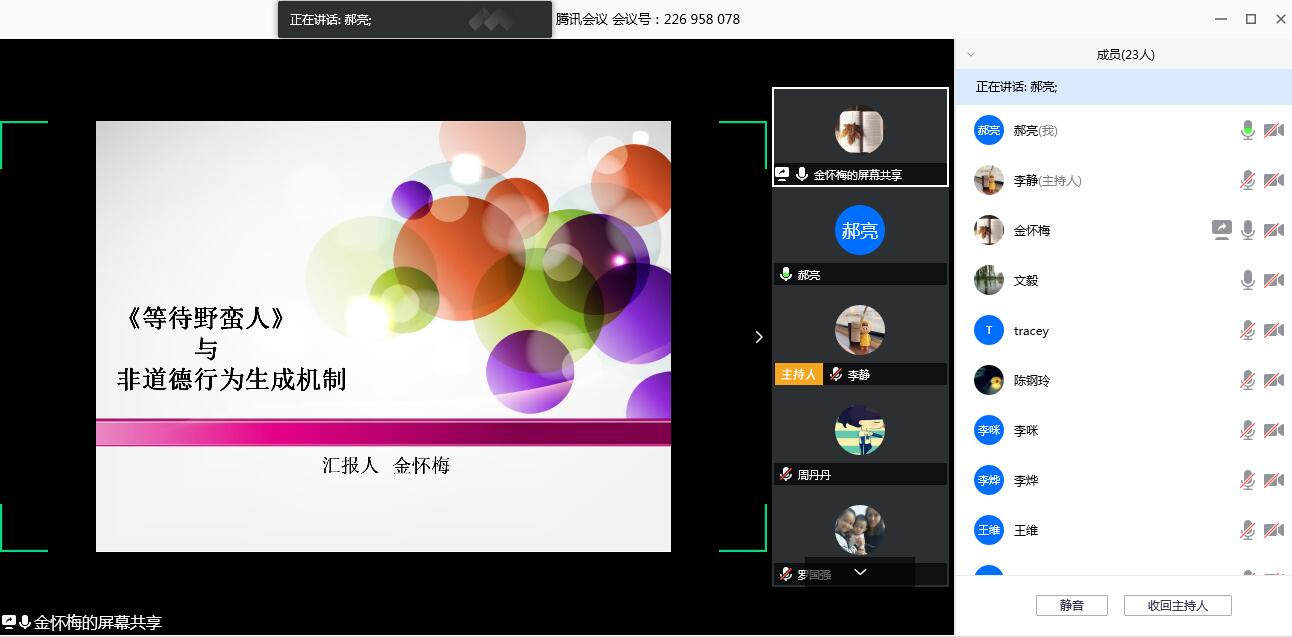 本网讯(通讯员:王婷)近日,外国语学院公共英语教学部利用腾讯会议平台开展了“教科研经验分享”活动,此次分享活动由金怀梅副教授主持。公共英语教学部副主任郝亮及全体教师参加分享活动。