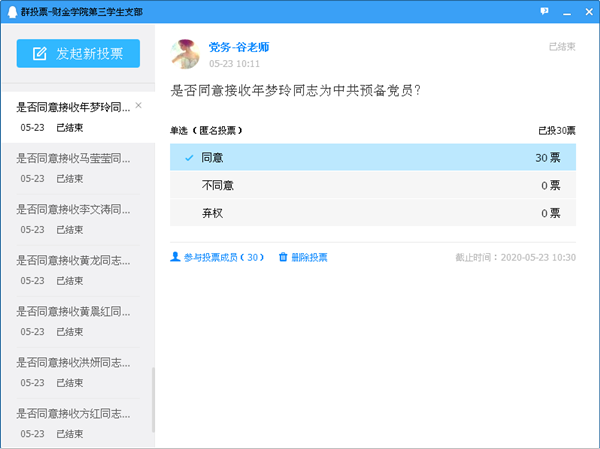 本批48名发展对象十分重视此次支部大会,身穿正装,表情严肃认真,通过视频用清晰的嗓音向支部党员们一一汇报对党的认识、入党动机、本人履历、家庭和主要社会关系情况,以及需要向党组织说明的问题。接着,入党介绍人逐一介绍发展对象情况,并就是否接收发展对象入党发表意见。再次,支委会向支部大会报告发展对象教育考察情况、政审情况、征求党内外群众意见和公示情况。最后,与会正式党员对发展对象能否入党进行充分讨论,并采取QQ群投票、麦客表单等无记名投票方式进行表决。