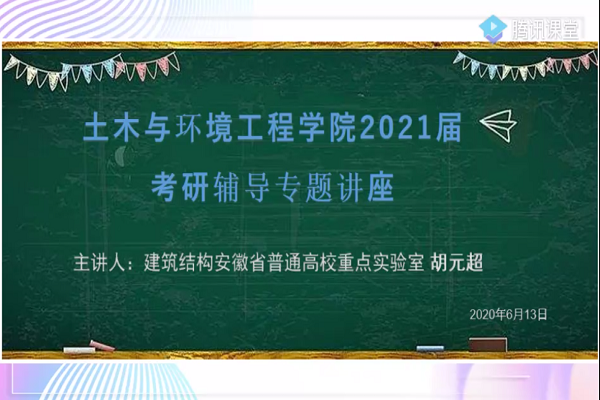本网讯(刘伟、程艳)为加强学生对考研知识和经验的了解,掌握相关的考研技巧,营造积极向上的考研风气,6月13日晚,土木与环境工程学院举办2021届考研辅导专题讲座,2021届考研学子参加讲座,青年教师胡元超主讲。