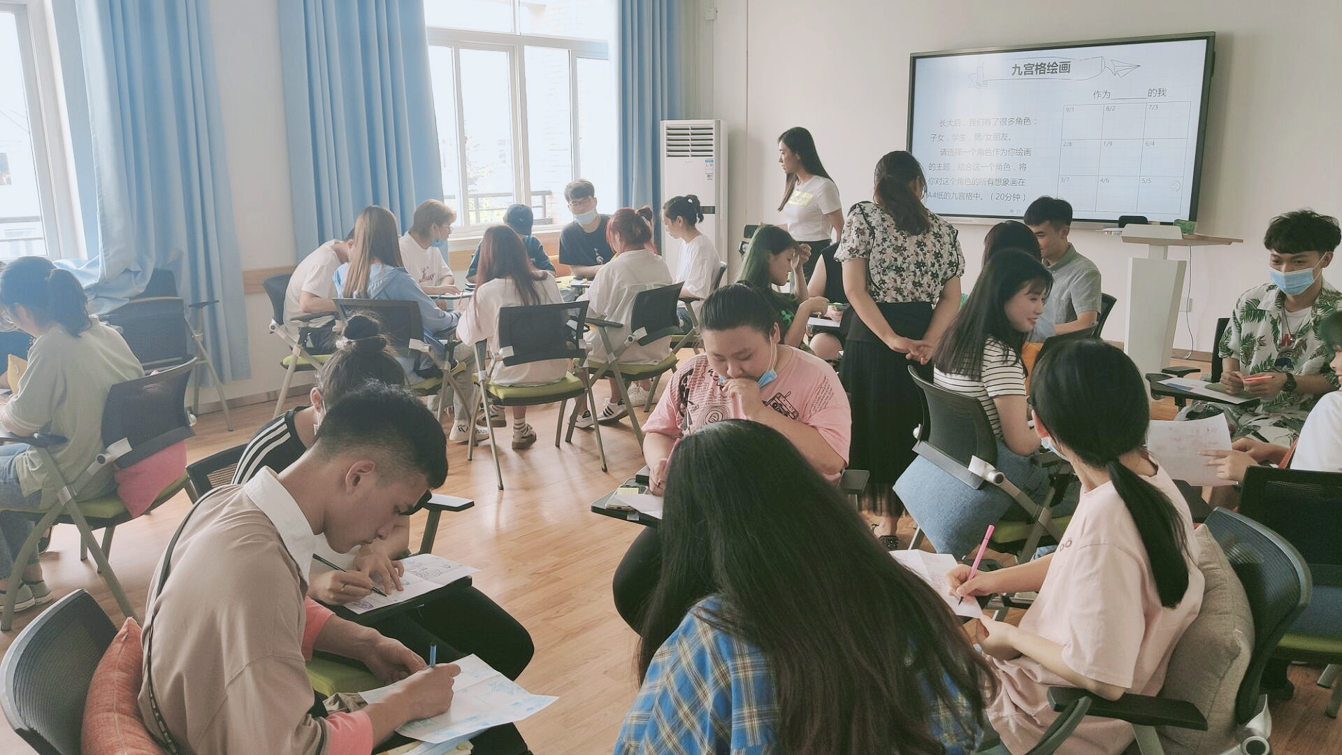 活动伊始,老师用“破冰-彩虹卡”活动,让同学们抽取一张符合自己目前心境的彩虹卡自由分组并互相介绍熟悉。随后请大家以“作为XXX角色的我”为主题体验九宫格绘画,同学们分享了自己作为兄妹、学生、子女的绘画感受,体验温暖而风趣。随后大家一起学习了埃里克森的个体心理发展阶段理论、大学生心理健康的标准、大学生的心理问题及如何进行调试等知识。最后大家就本次培训感受做了积极地分享与交流。