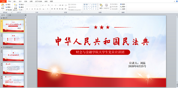 为了响应党中央的号召,积极开展民法典普法工作,让民法典走到群众身边、走进群众心里,宣讲团成员于6月17日开展线下集体备课,反复打磨宣讲PPT、精选相关视频材料,讨论宣讲技巧等,并根据各班期末考试等情况,于六月中下旬至七月初进行了线上或线下的集中宣讲,效果颇佳,反响热烈。